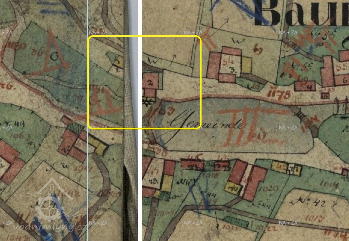 Voda využívána k pohonu mlýna o dvou složeních a 1 stoupě. Výpustný žlab rybníka má 2 stavidla 0,6 a 0,65 m široké, obě 2,1 m hluboká. Mlýnský žlab je 3,585 m dlouhý, 1,15 m široký a 0,77 m hluboký se dvěma stavidly ke kolům 0,63 m širokými a 0,7 m vysokými. Dvě kola na svrchní vodu, pro mlýnské složení průměr kola 3,64 m, pro stoupy průměr 3,48 m.