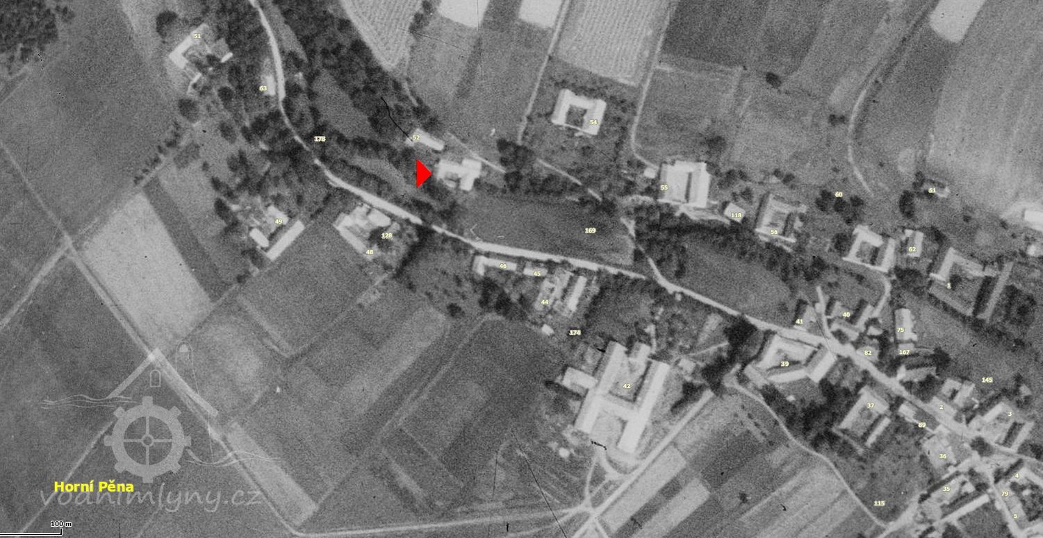 Mlýn v Horní Pěně je matrikami doložen v druhé polovině 18. století. Dnes po něm zůstala jen část zdi a klenutého sklepa ve svahu u cesty k čp. 52. Vše co z mlýna zůstalo po druhé světové válce a další navážka zaplnilo bývalý obecní rybník.