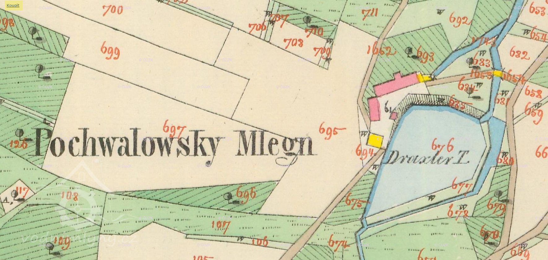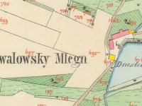 První mlýn na Smolnickém (Pochválovském) potoce, v roce 1923 veden jako zaniklý, 1938 na letecké mapě jen nejasné zříceniny, dnes pouze zarostlé základy a terénní nerovnosti.