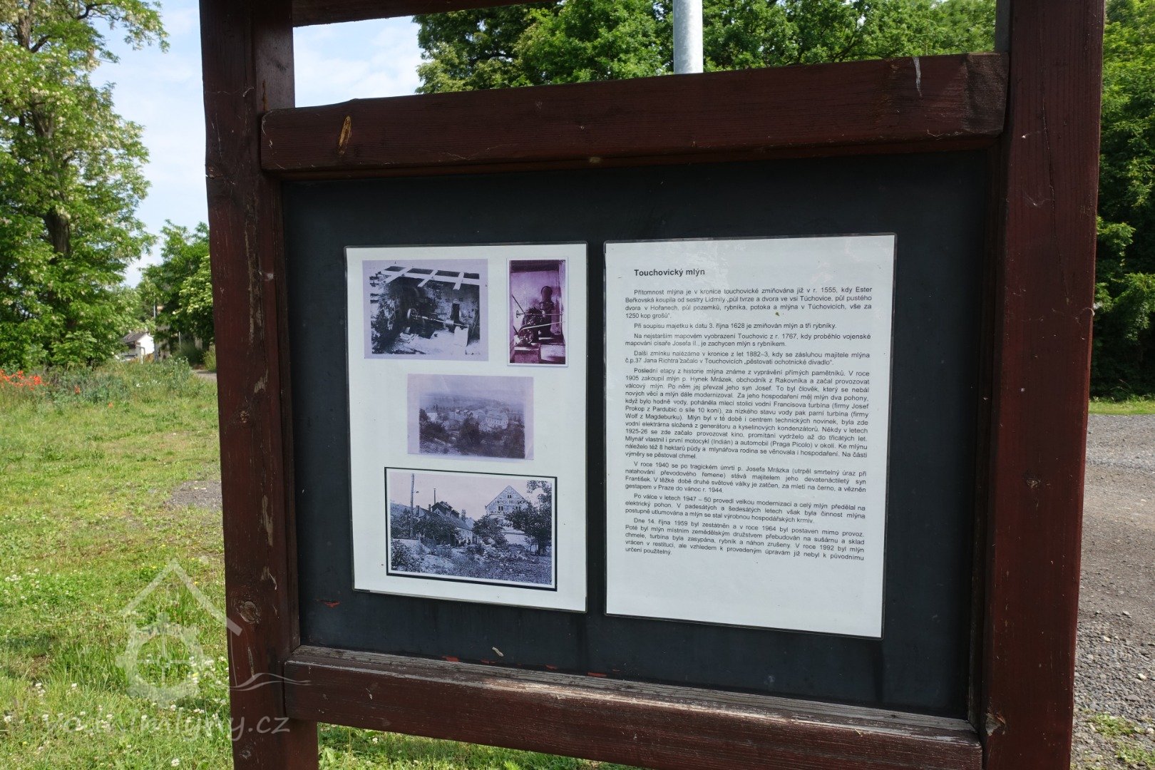 Mlýn na východním okraji Touchovic, připomínaný již k roku 1555. Za I. republiky podstatně rozšířen a modernizován podnikavým Josefem Mrázkem, v letech 1947-1950 opět modernizován a přebudován na elektrický pohon, ale 1959 znárodněn a o pět let později zastaveno mletí a mlýnice přeměněna na sušárnu chmele. 1992 restituován, ovšem jako mlýn již nepoužitelný.