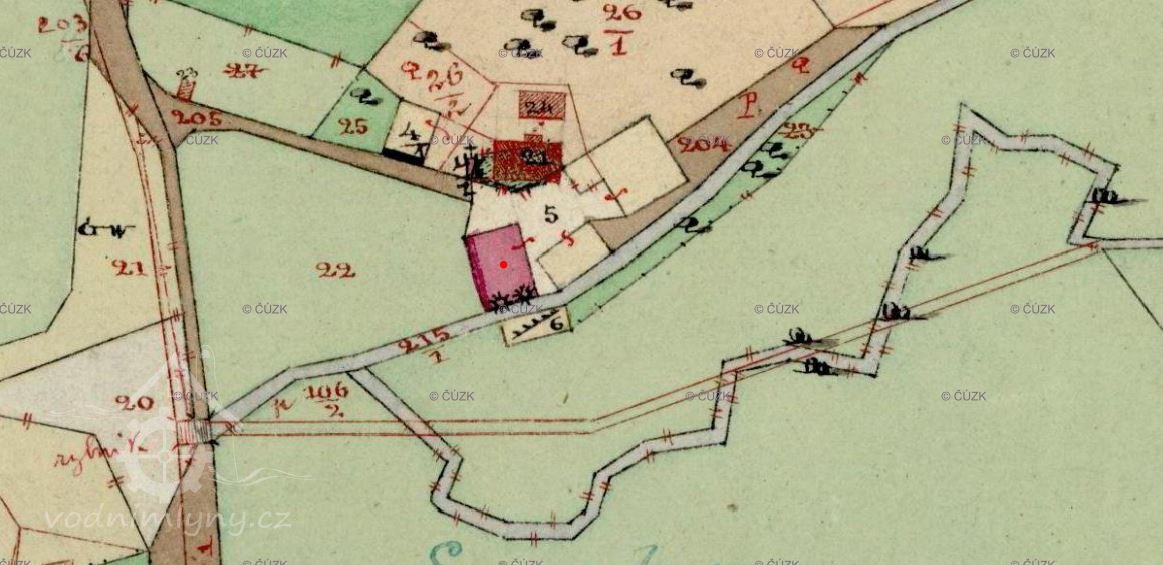 Mlýn je zakreslen na II. i III. Vojenském mapování. Na indikační skice stabilního katastru 2 kola v nespalné budově, na druhé straně pila ve spalné budově, okolo mlýna další 2 spalné budovy a zděná kaplička. Stejné na otisku stabilního katastru z roku 1837.