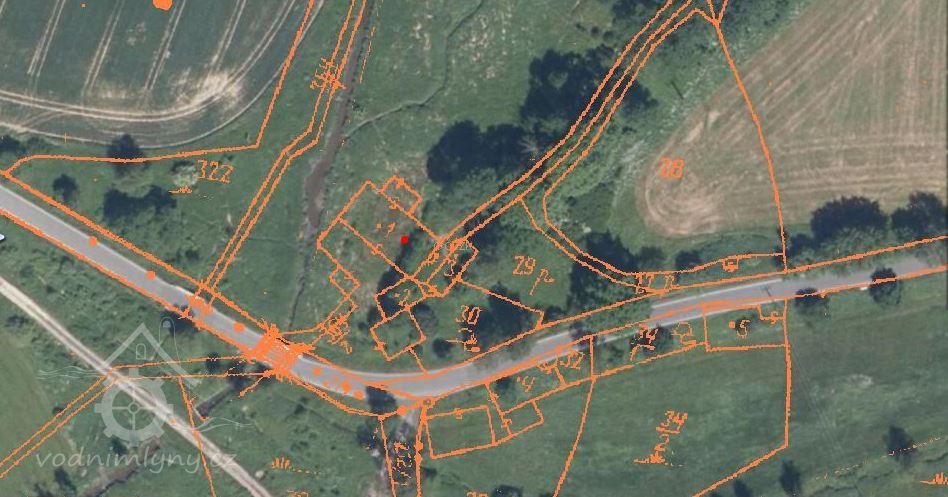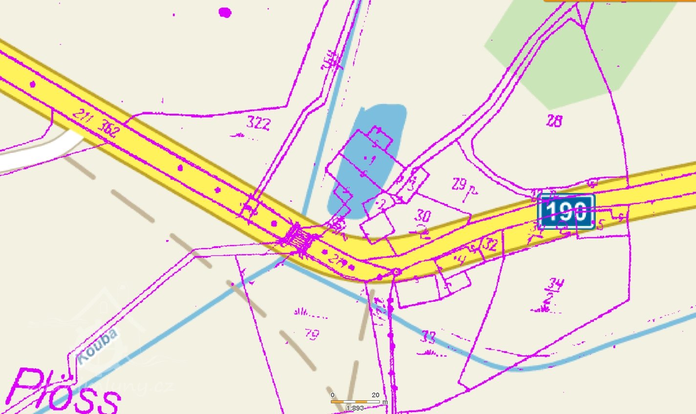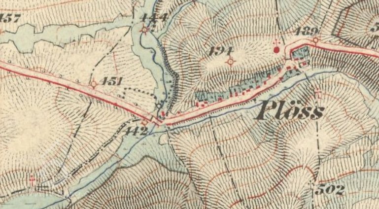 Seznam a mapa vodních děl republiky Československé 1930 : Chamský potok ( Kouba ) Pláně, František Stauber, mlýn a pila, 1 kolo na svrchní vodu, 0,104-3,6-3,2.