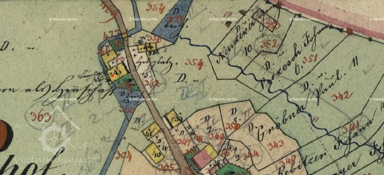 Obec je na I. vojenském mapování, bez značky mlýna. V letech 1806 -1809 je zde uváděn mlynář Ferdinand Portner. Na II. Vojenském mapování ( 1836-1852 ) je uveden MM a SM. Je i na III. vojenském mapování. Skica stabilního katastru z roku 1838:  dvě spojené nespalné budovy do písmene U s 1 kolem, trojúhelníková vodní nádržka, druhá budova bez vodního přítoku bude zřejmě bývalá pila, na otisku budovy mlýna, pila bez kola. Schallerova topografie tu v roce 1839 uvádí mlýn a pilu. Obyvatelsto německé národnosti.