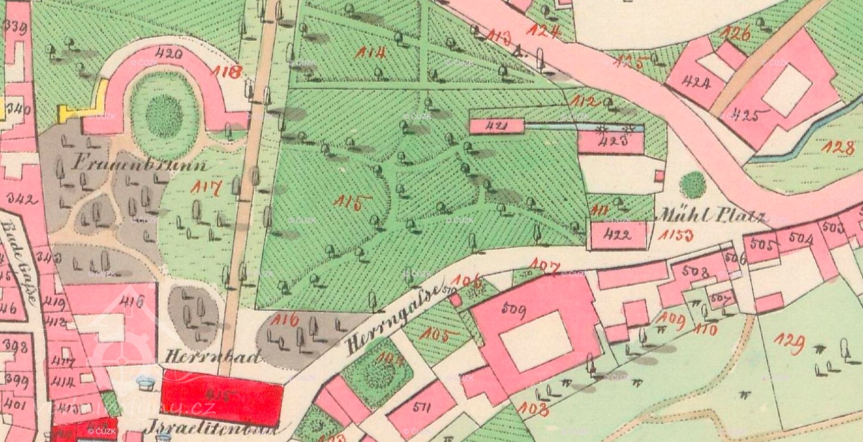 Velmi starou žánrovou zimní vedutu na Mlýnském náměstí vytvořil malíř C. Croll roku 1834. Vpravo spatříme horní mlýn, vlevo hospodu U Zelené žáby, kde bývalo velmi živo. Za hospodou směrem vpravo se nachází cesta lemovaná topoly, která stoupá vzhůru k Lázeňskému náměstí. Jedná se o pozdější Seumeho a dnešní Rooseveltovu ulici. Vpravo od mlýna pak již není na vedutě vidět ulici stoupající vzhůru, která se dnes jmenuje U Císařských lázní.