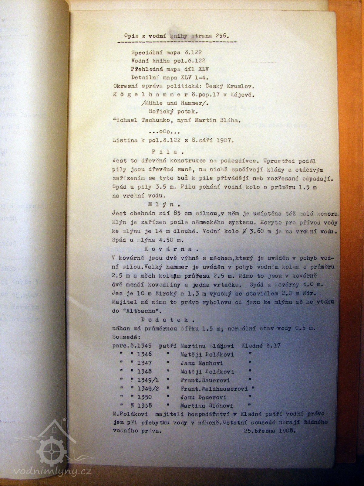 Ve vodní knize ze zápisu z roku 1907: pila- dřevěná konstrukce na podezdívce. Spád u pily 3,5 m. Pilu pohání kolo o průměru 1,5m na vrchní vodu. mlýn- Německého systému. Koryto ke kolu je dlouhé 14 m. Vodní kolo je v průměru 3,6 m a je na vrchní vodu. Spád 4,5 m. kovárna- Měch průřezu 2.5 m. Dvě kovadliny a vrtačka. Pohání je kolo o průměru 2,5 m. spád 4 m.