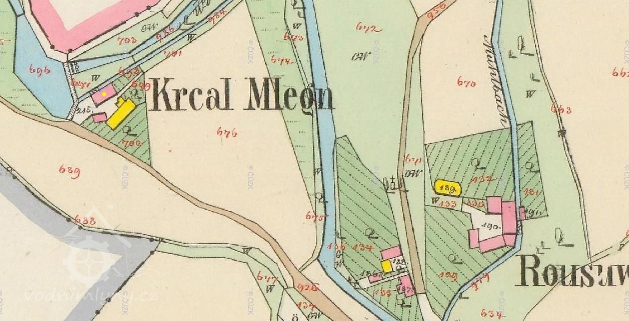 1704 Anna Šebková, platí 3/16 zl., mlýn Krcál o 1 složení s 1 kolem. Mlýn je bez vody a samou sijí mezi lidmi se živí.