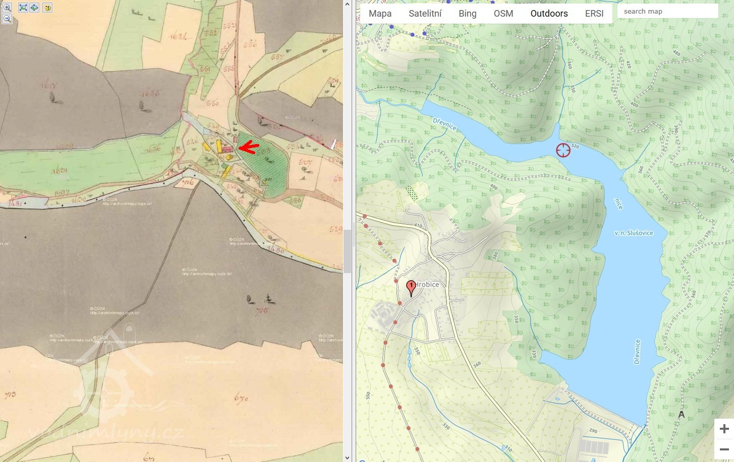mlýn byl v horní polovině Vodní nádrže Slušovice