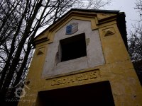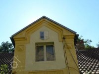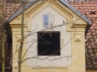 Vikýř obytné budovy s mlynářským znakem, čp. 14 a rok zal. 1795, 2019, © doxa, (Prvky na obrázku: epigrafické památky (nápisy, datování aj.), zdobený zděný štít)