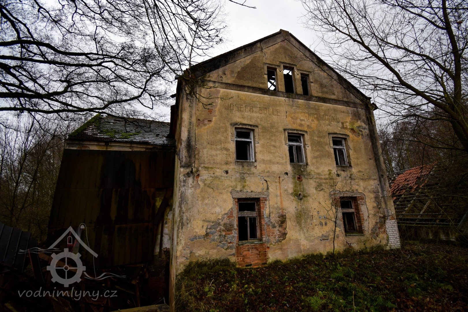 Severní průčelí mlýnice s nápisem JOSEFA ŠOLLE MLÝN NA HUTISKU (?), 2019, © doxa