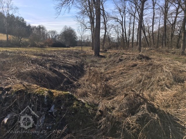 Z potoka vedl po louce delší náhon ke stavidlu. Turbínový domek - odtokový kanál zpět do potoka.