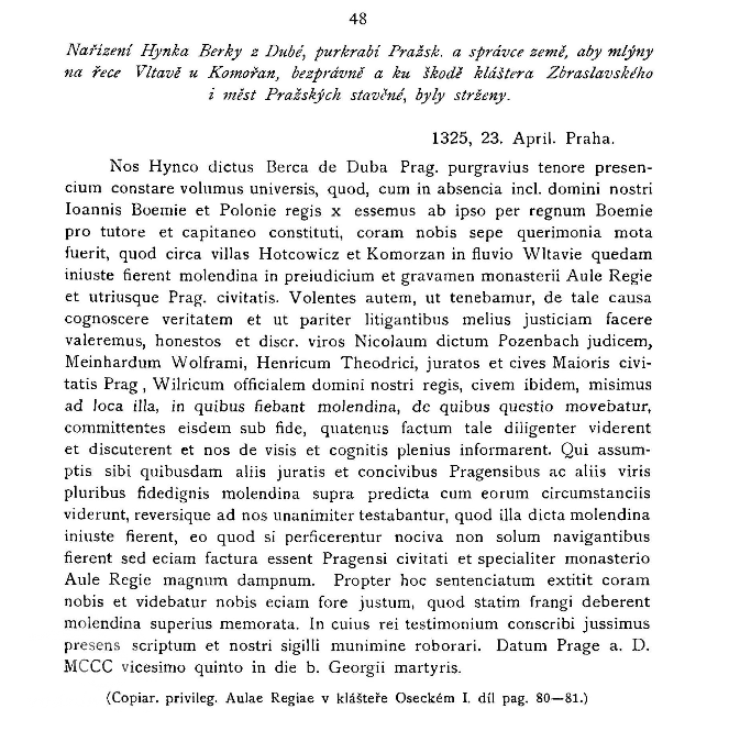 23. dubna 1325 zemský hejtman Hynek Berka z Dubě nařídil, že mlýny u Komořan a Hodkoviček, které byly bezprávně postaveny na škodu kláštera Zbraslavského i obou měst Pražských, mají být strženy (Tadra, Listy kláštera Zbraslavského, č. 48; originální latinský text viz obrazová příloha)