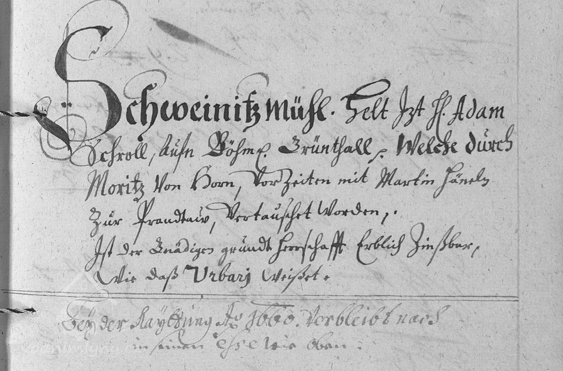 Schweinitz Mühl. Hält jetzt H. Adam Schroll, aus Böhmisch Grünthal . Welche durch Moritz von Horn, vor Zeiten mit Martin Hänelz zur Prandtow vertauscht worden.