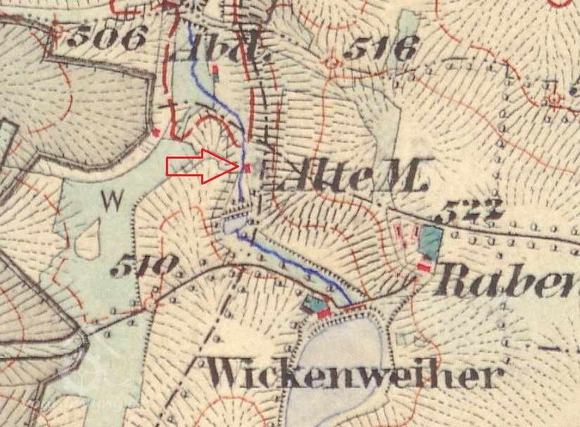 Mlýn stál na Starém potoku několik desítek metrů pod rybníkem Froschteich (Žabí rybník), který už dnes není na mapách. Mlýn zanikl již koncem 19. století. Trochu výše po proudu potoka se nachází dosud existující Tovární rybník. Starý potok je pravostranným přítokem Hamerského potoka.
