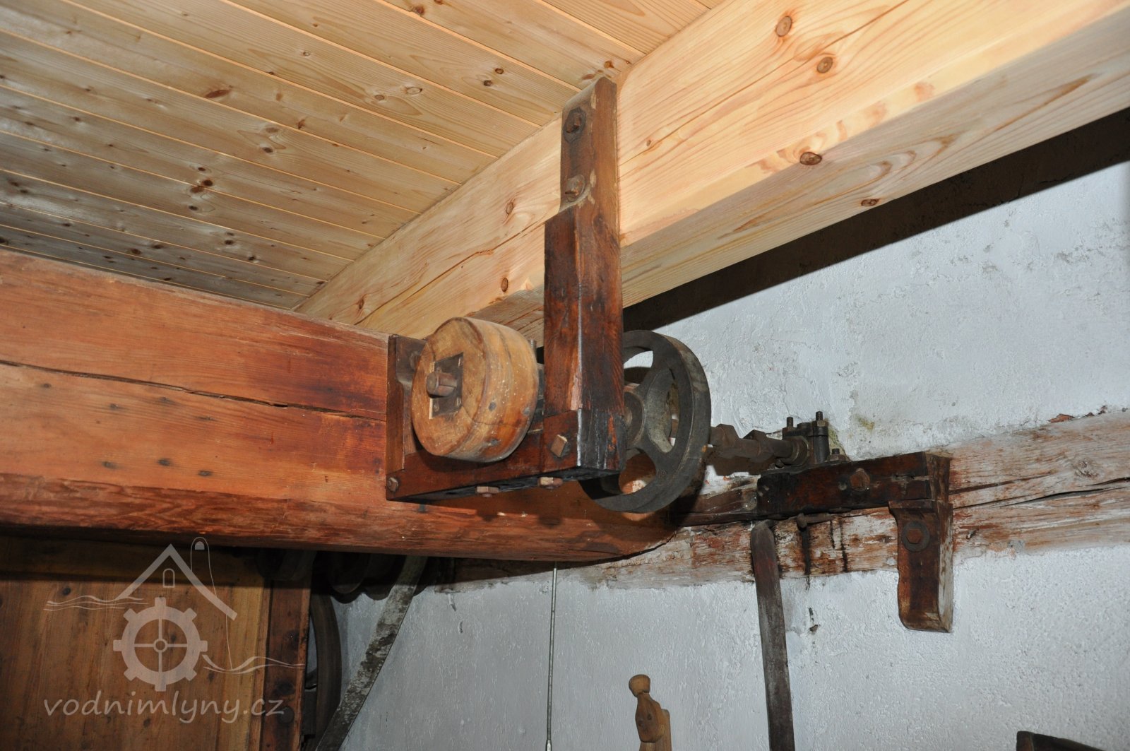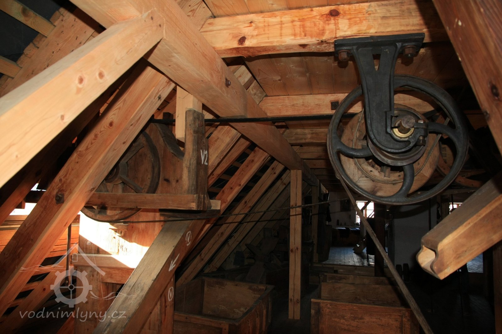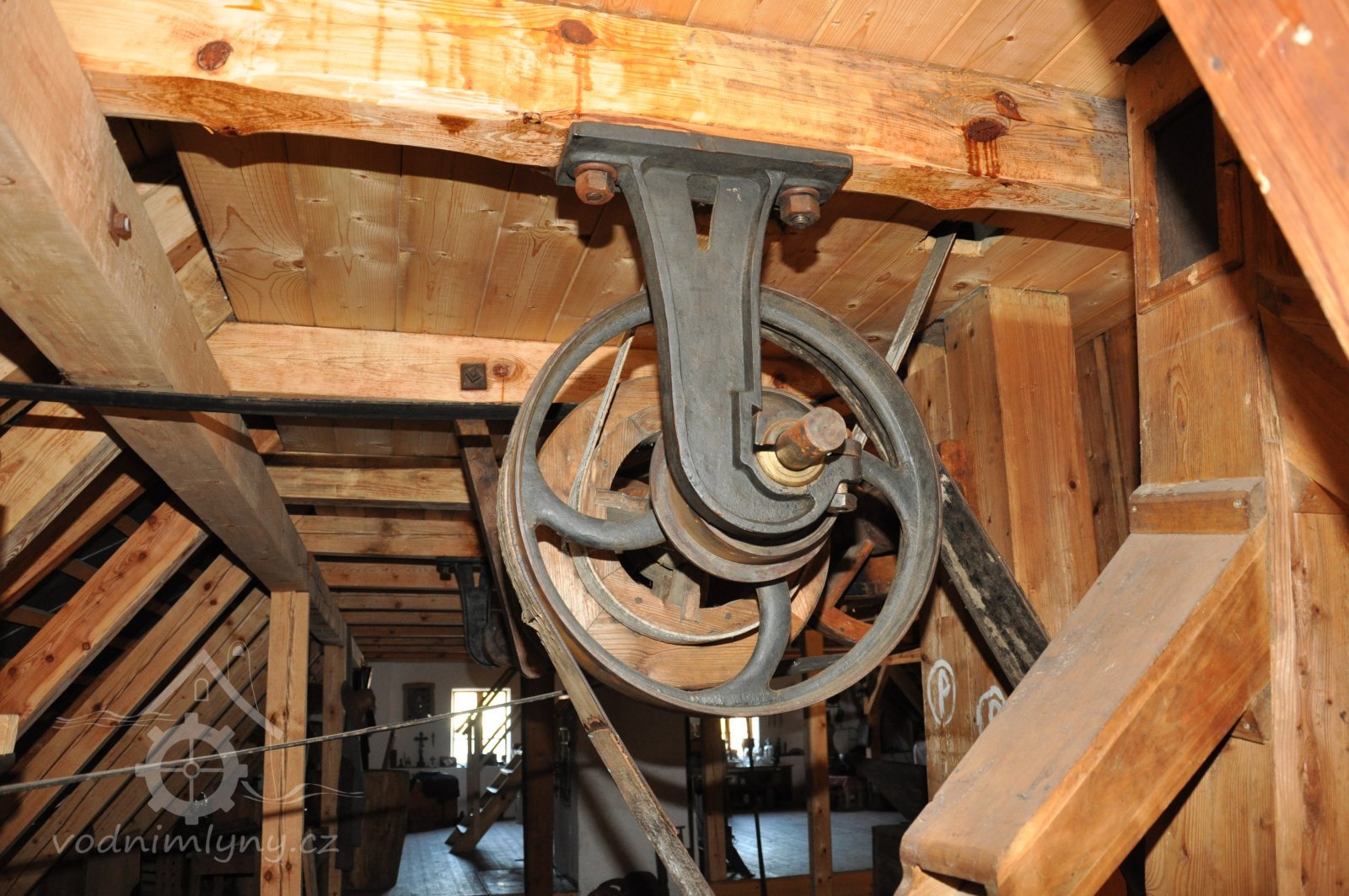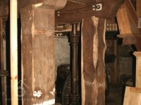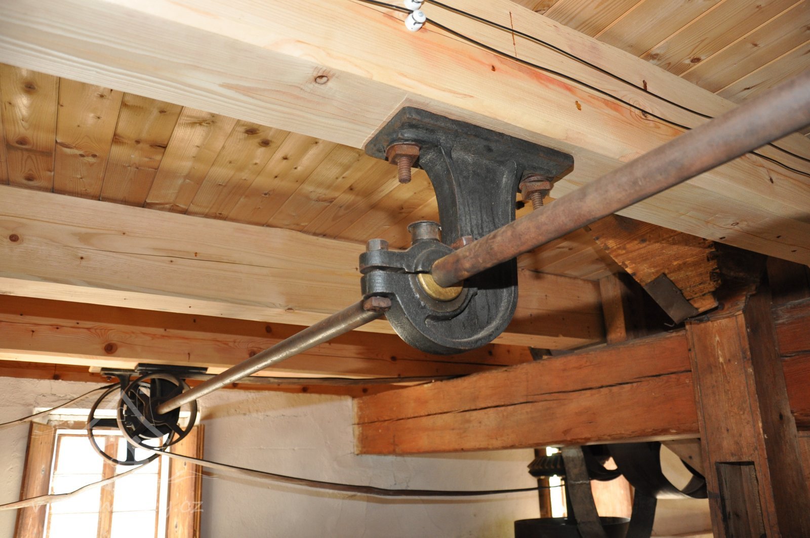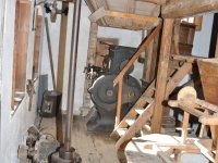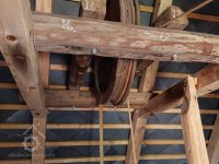 Pravoúhlý převod z hřídele vodního kola na svislou transmisi, 2013, © Šimek, (Prvky na obrázku: transmise, řemenice, převody)