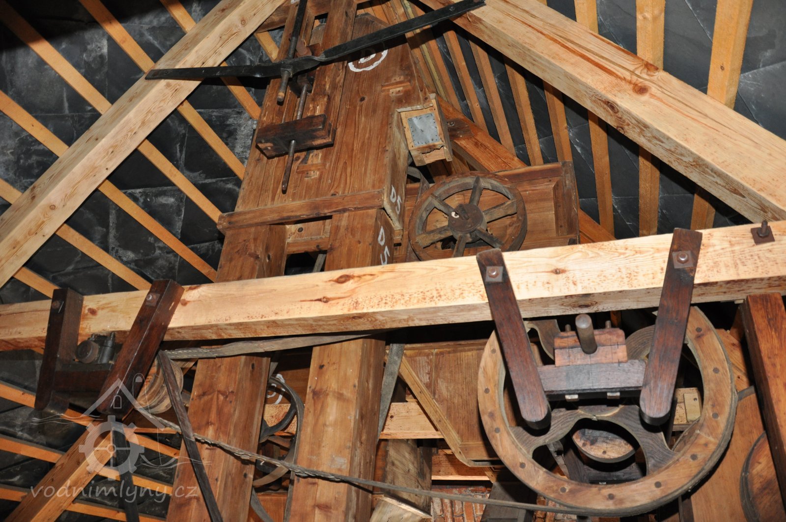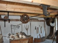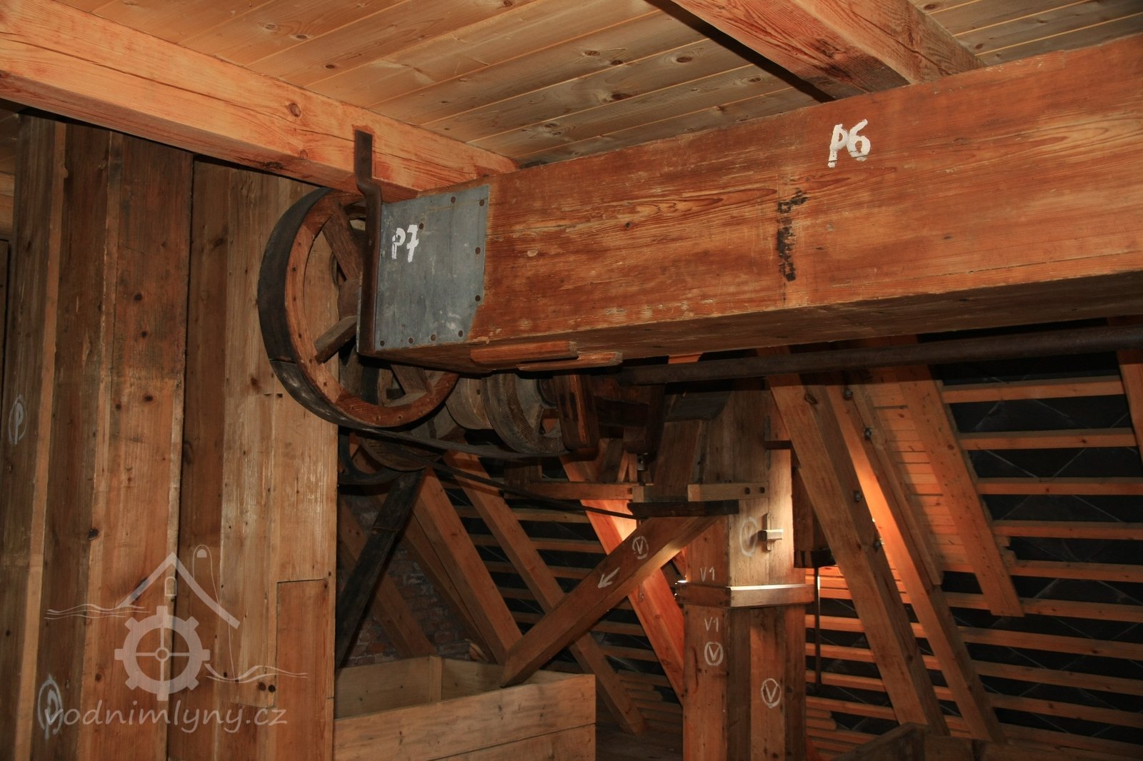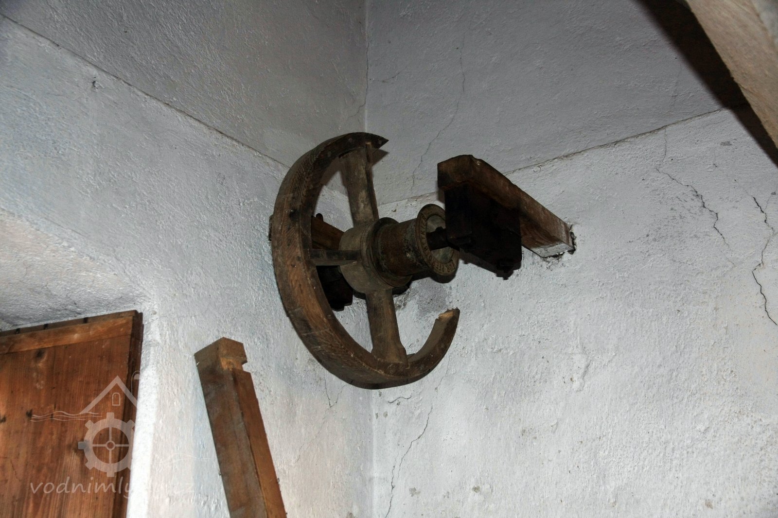 Pravoúhlý převod z hřídele vodního kola na svislou transmisi, 2013, © Šimek, (Prvky na obrázku: transmise, řemenice, převody)