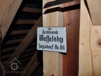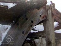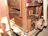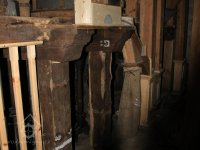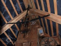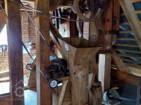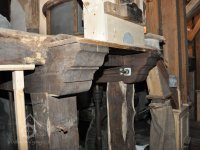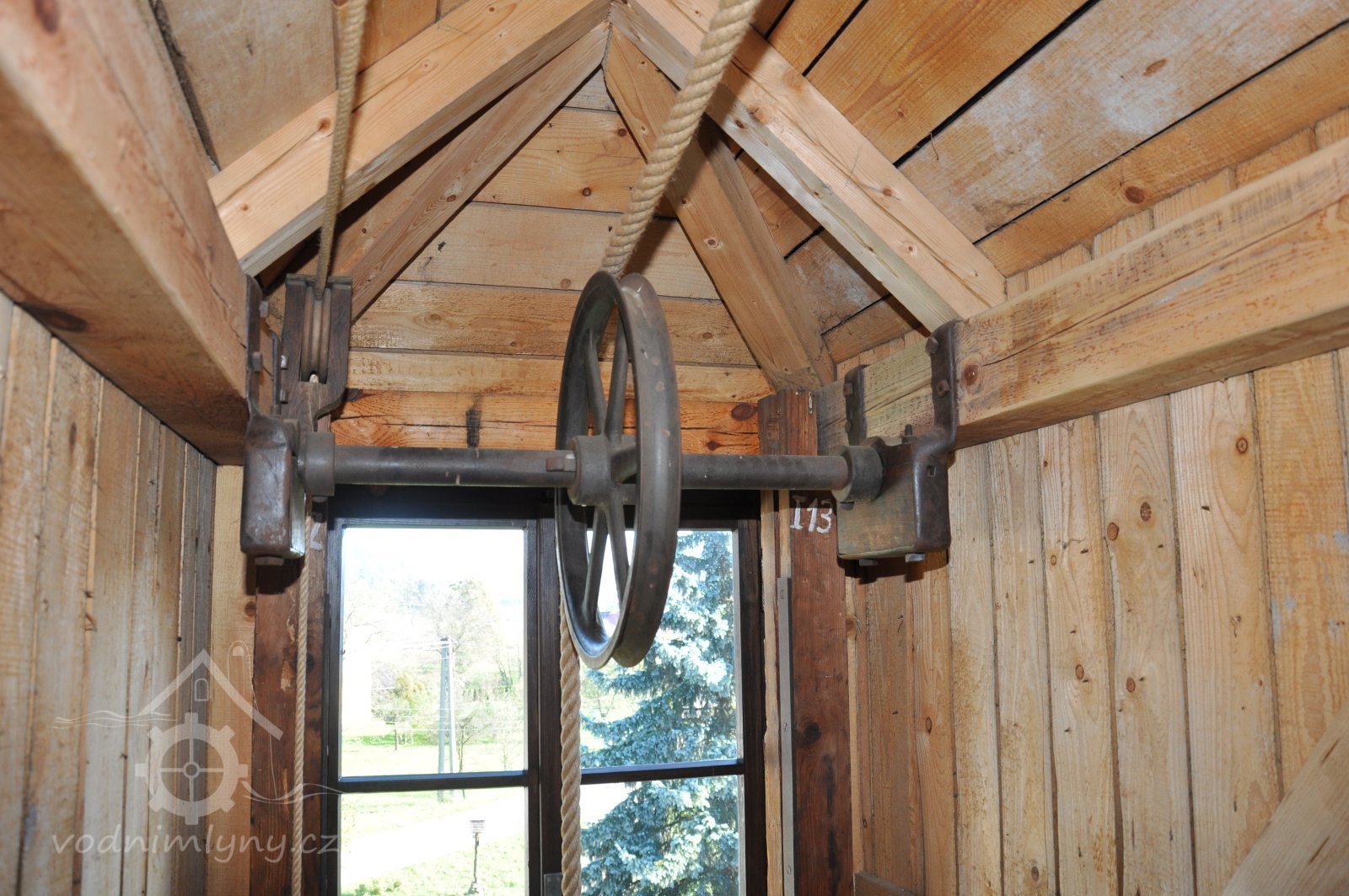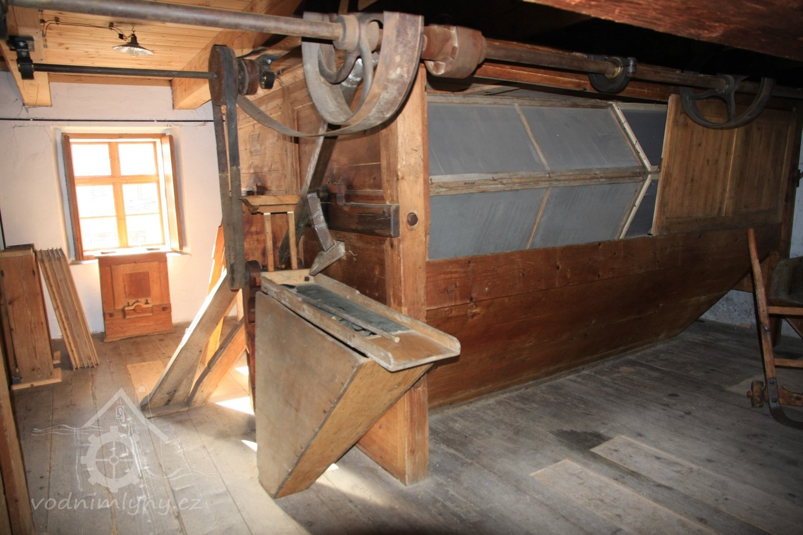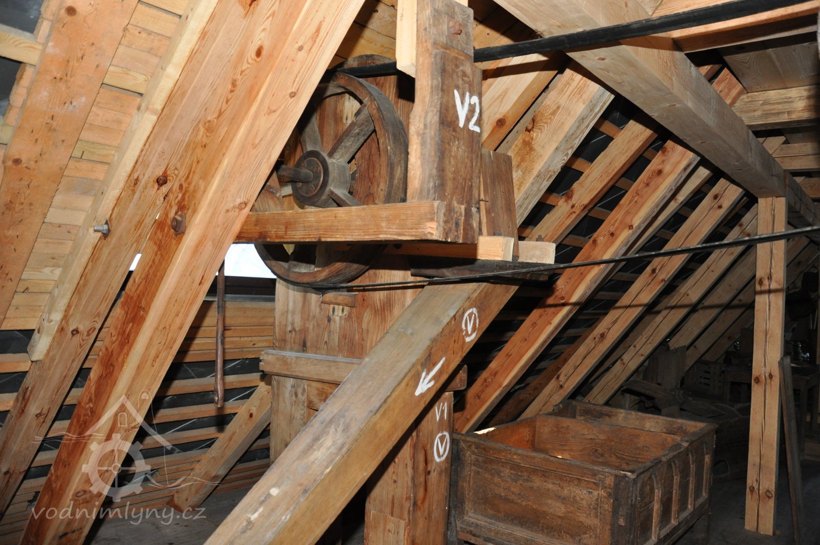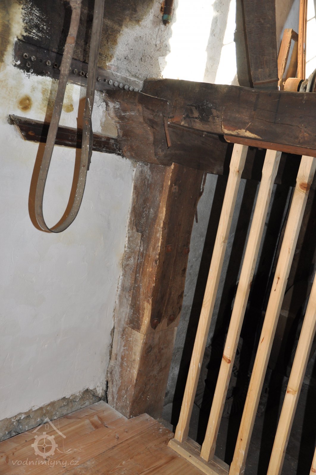 Pravoúhlý převod z hřídele vodního kola na svislou transmisi, 2013, © Šimek, (Prvky na obrázku: transmise, řemenice, převody)