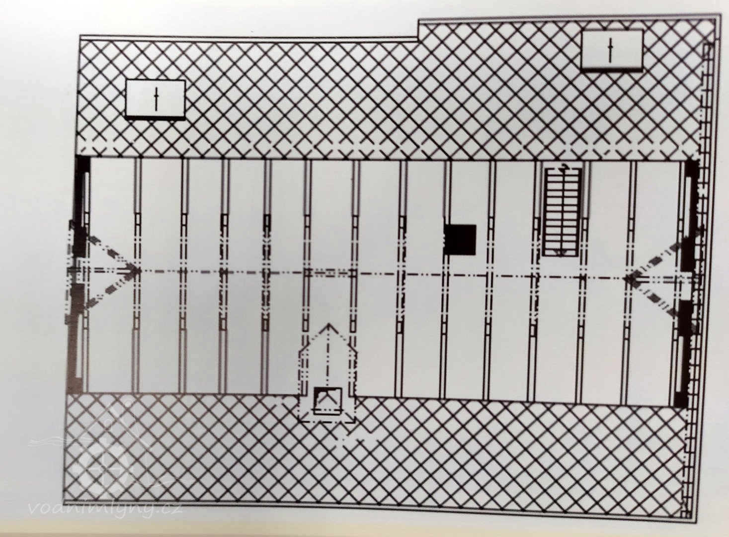 Technologie v podstřeší, 2013, © Šimek, (Prvky na obrázku: koukolník, vysévač hranolový, výtahy a dopravníky, zásobník, násypka)