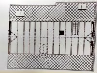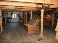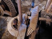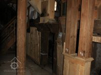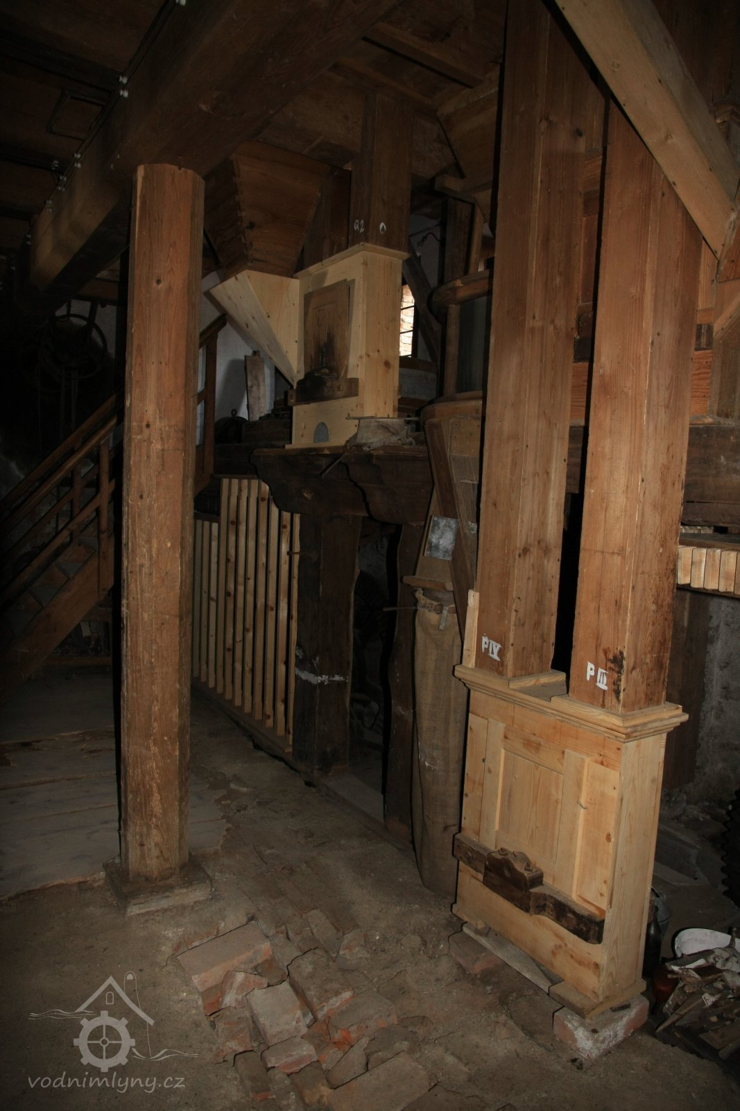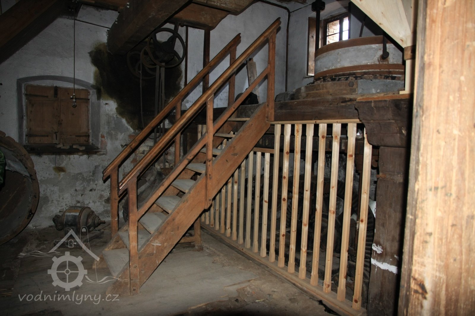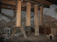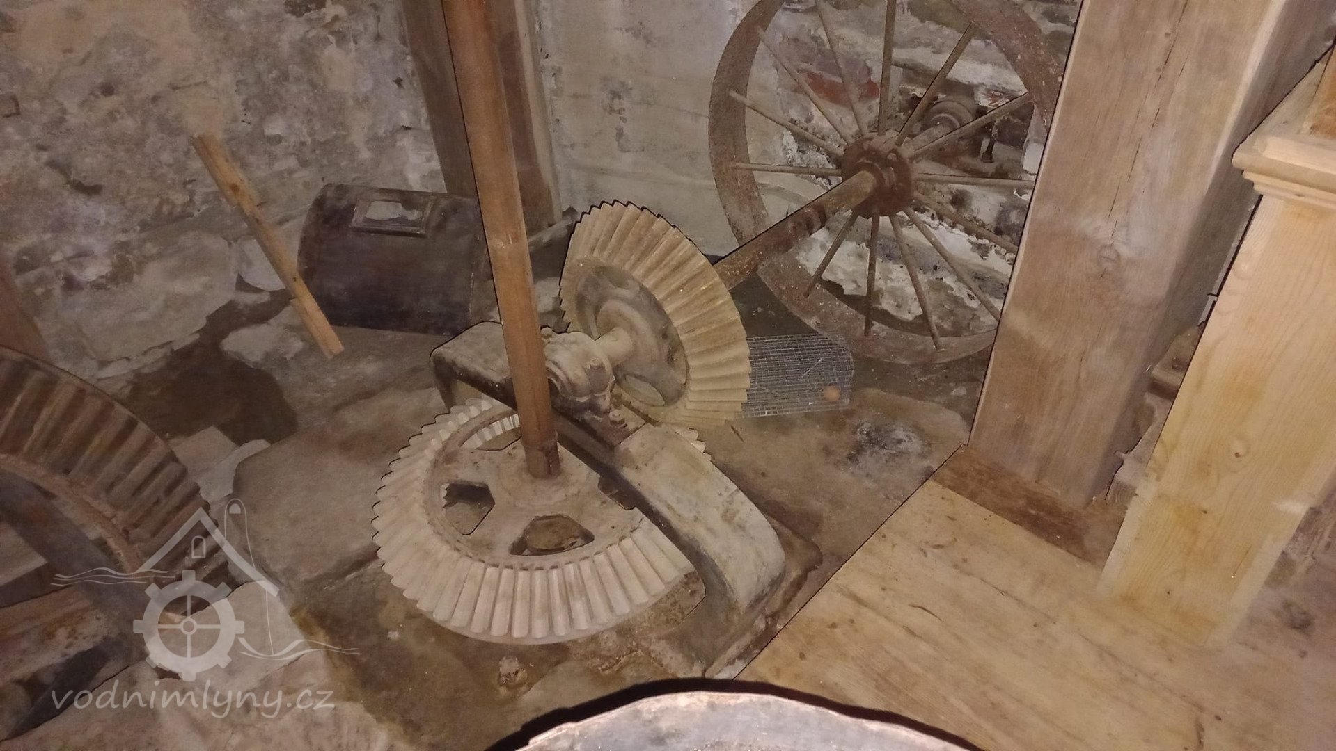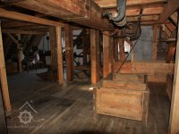 Dvě královské hřídele prostupující mlecí podlahu, 2013, © Šimek, (Prvky na obrázku: transmise, řemenice, převody, kamenné složení (šrotovací, mlecí))