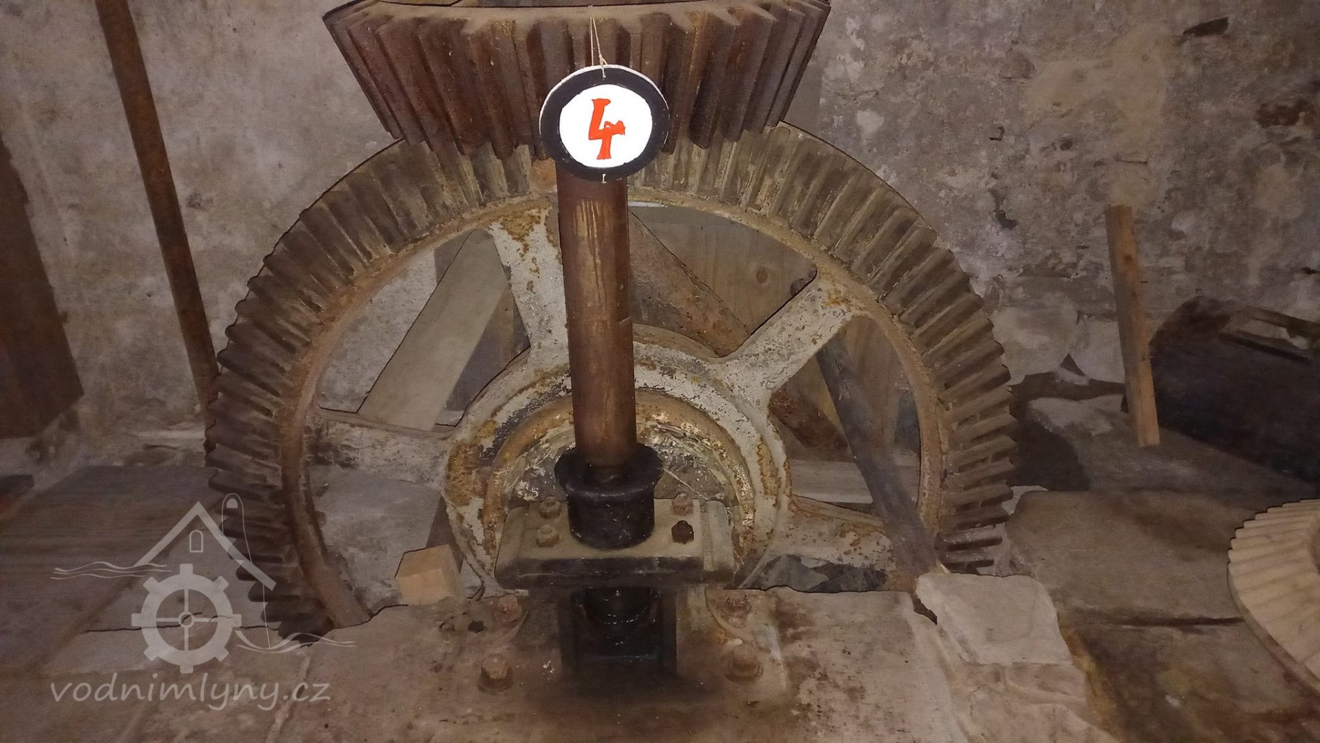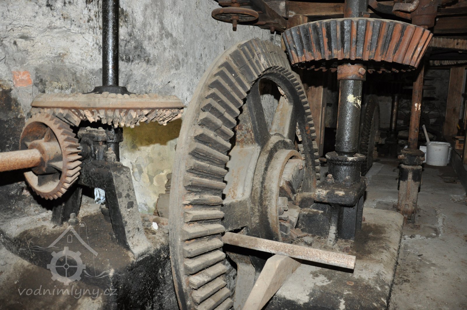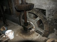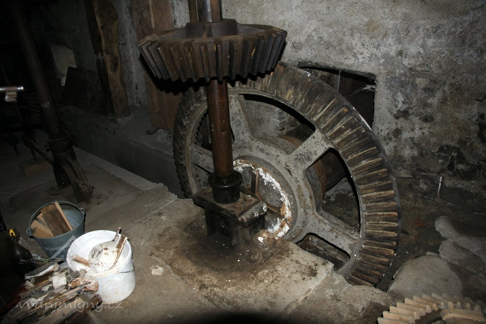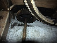 paleční převody a soukolí od 1. vodního kola a pata jednoho z kapsových dopravníků, 2014, © David Veverka, (Prvky na obrázku: transmise, řemenice, převody, výtahy a dopravníky)