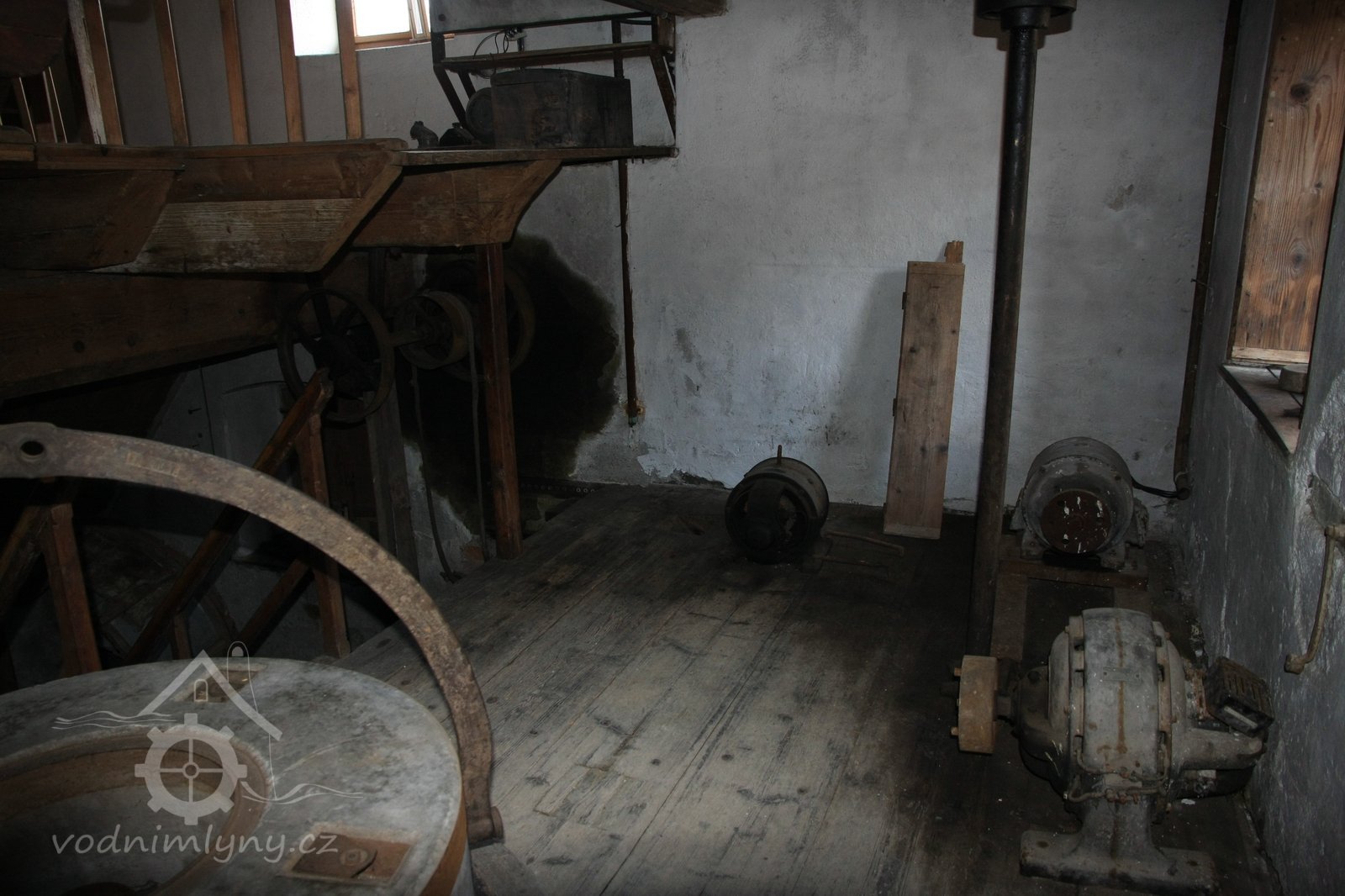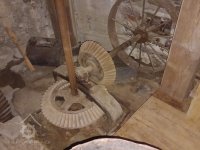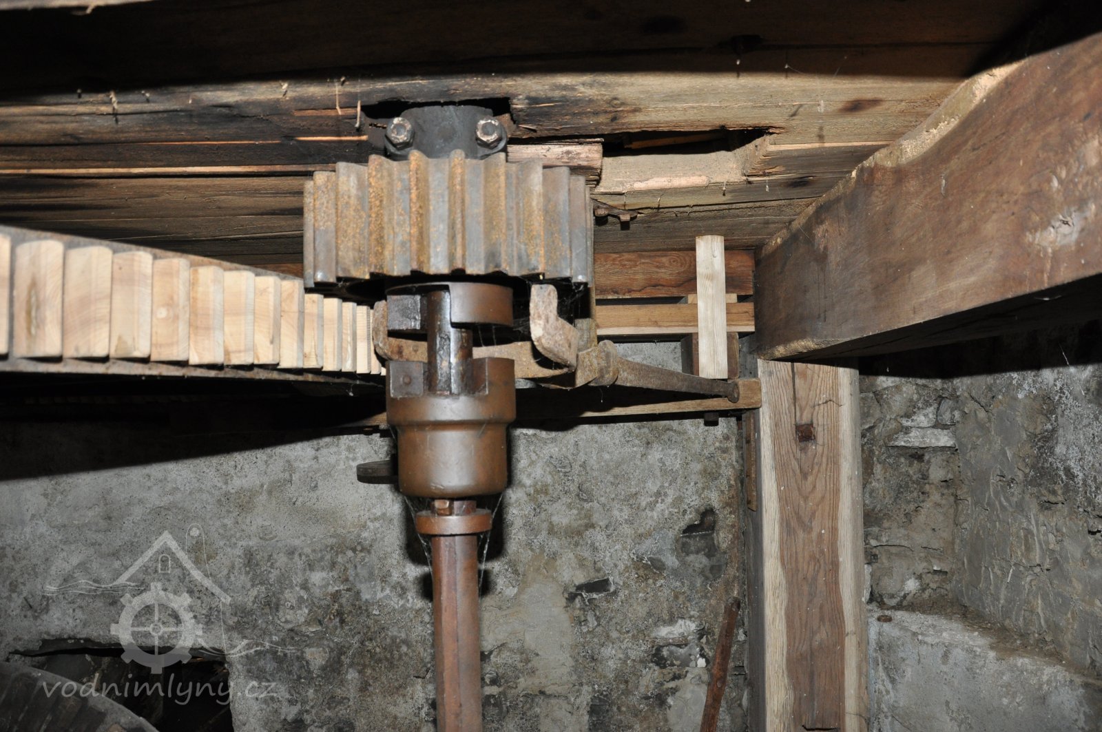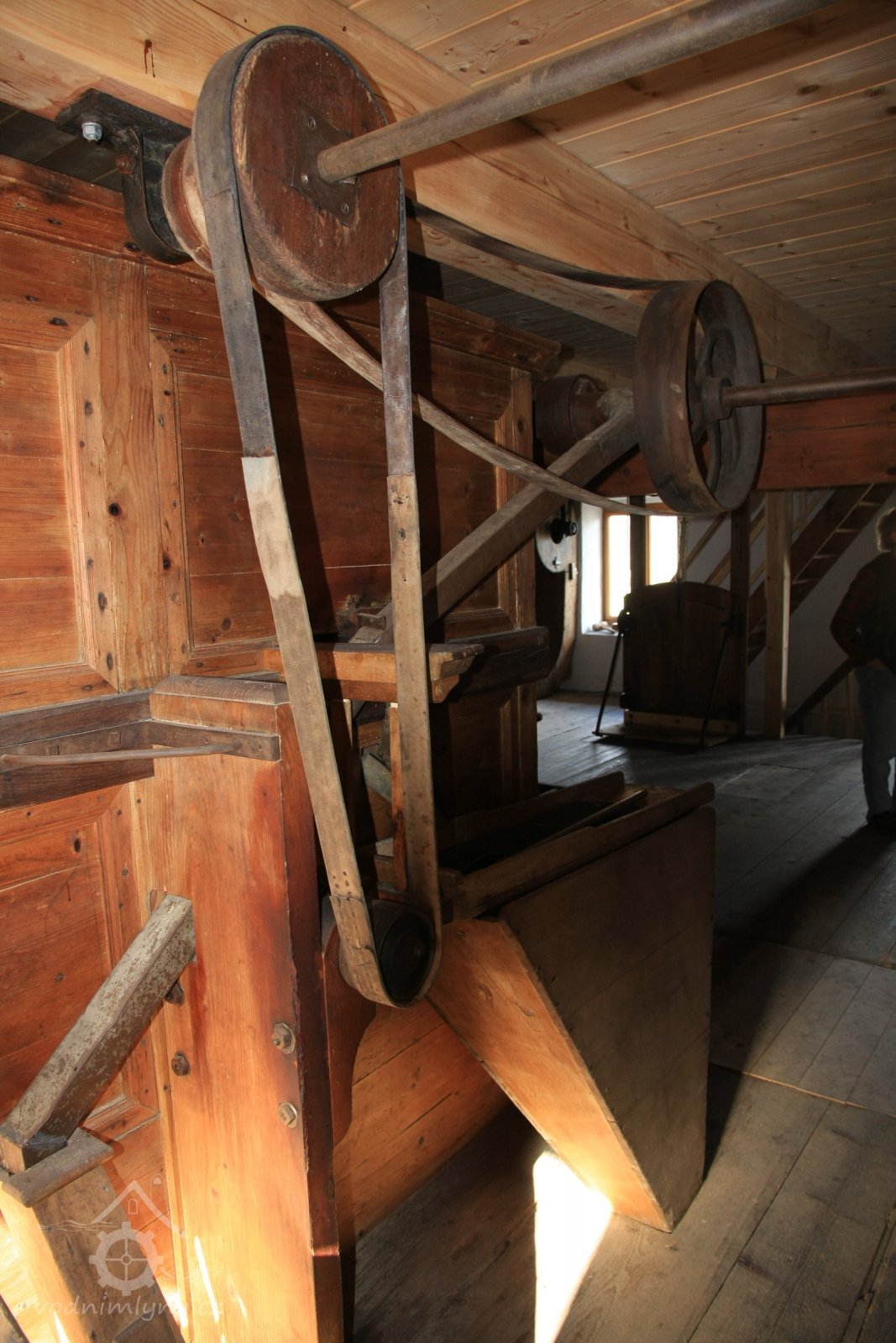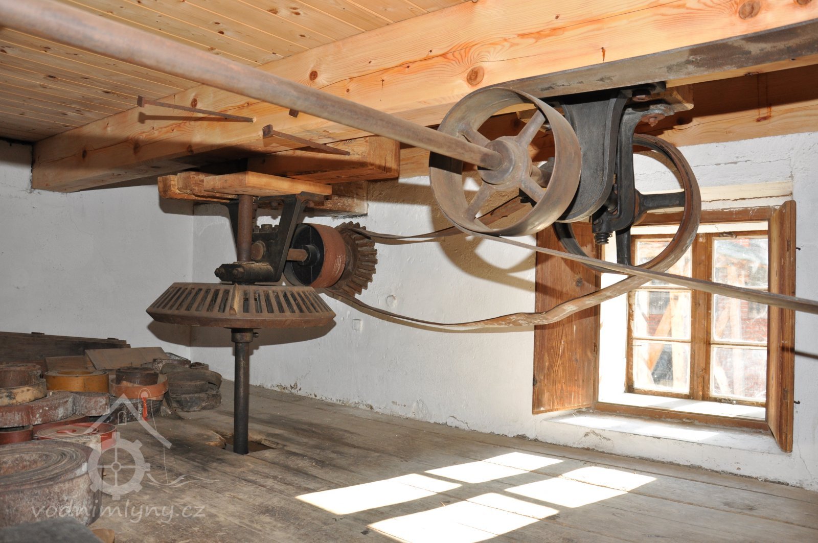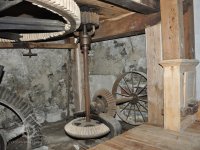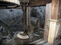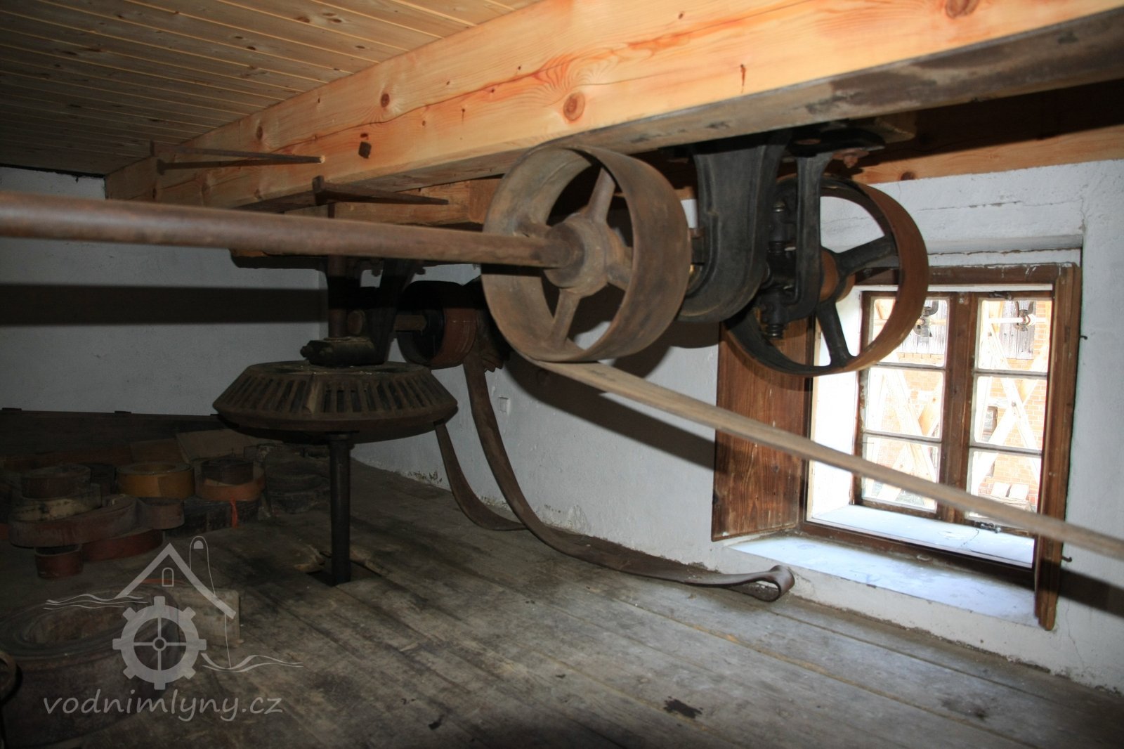 Pohled do podkolí uměleckého mlýna, 2013, © Šimek, (Prvky na obrázku: transmise, řemenice, převody)