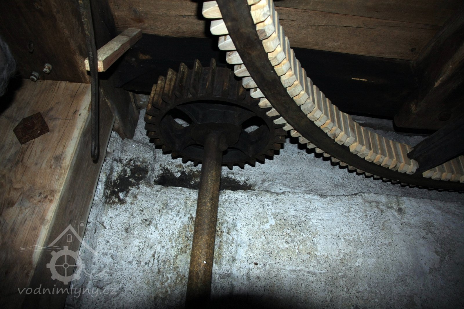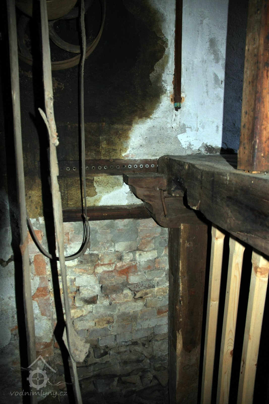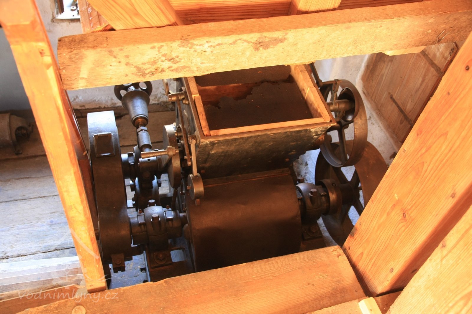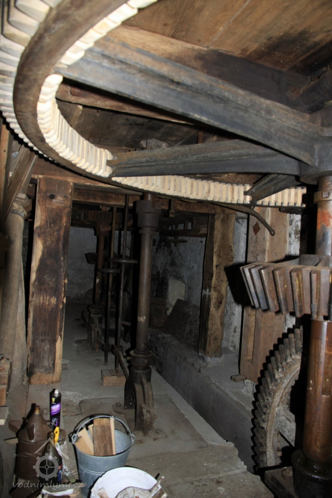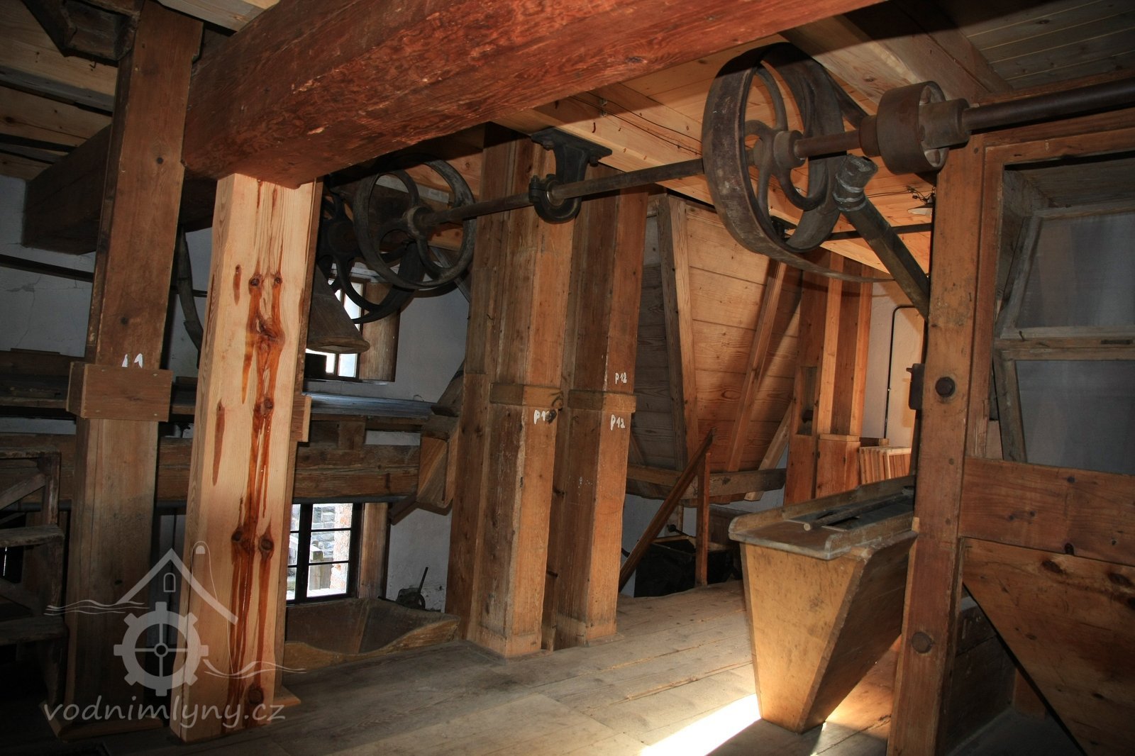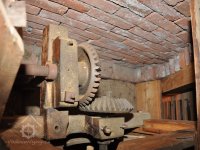 Pohled do podkolí uměleckého mlýna, 2013, © Šimek, (Prvky na obrázku: transmise, řemenice, převody)