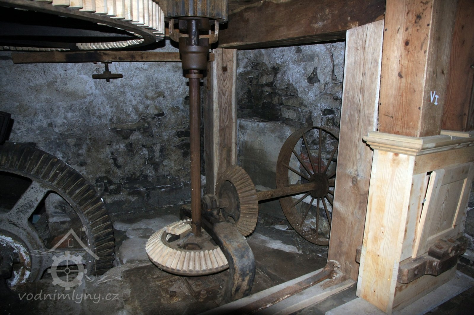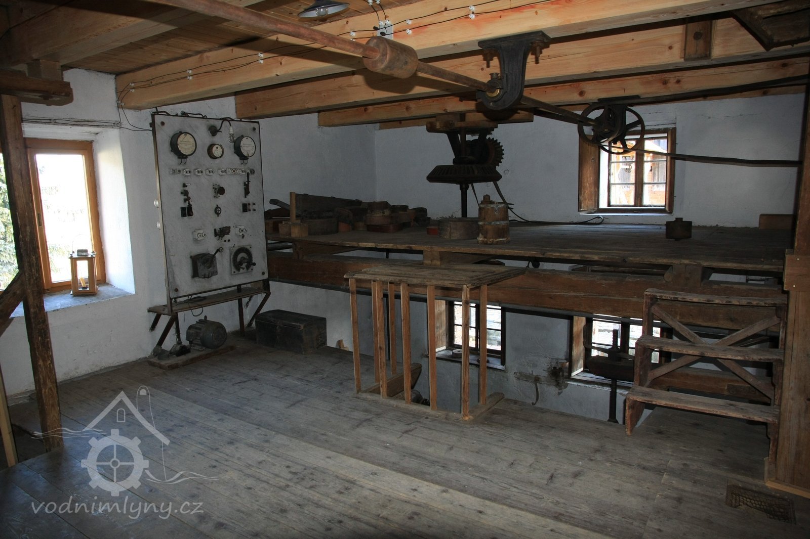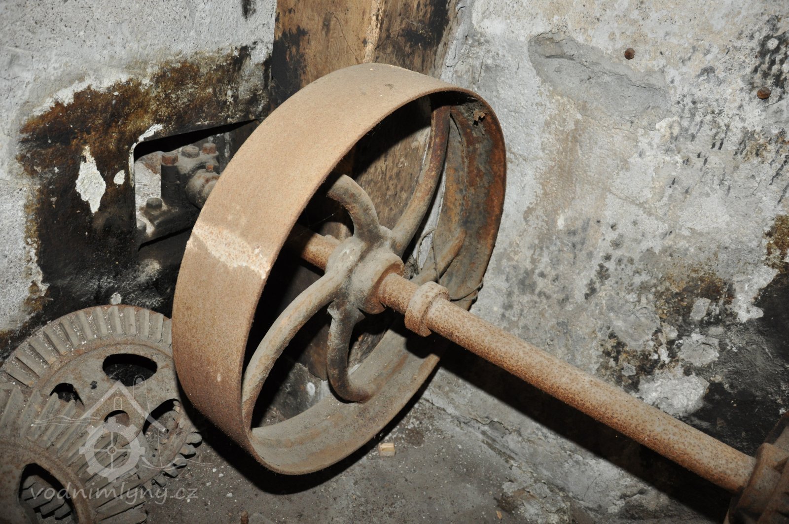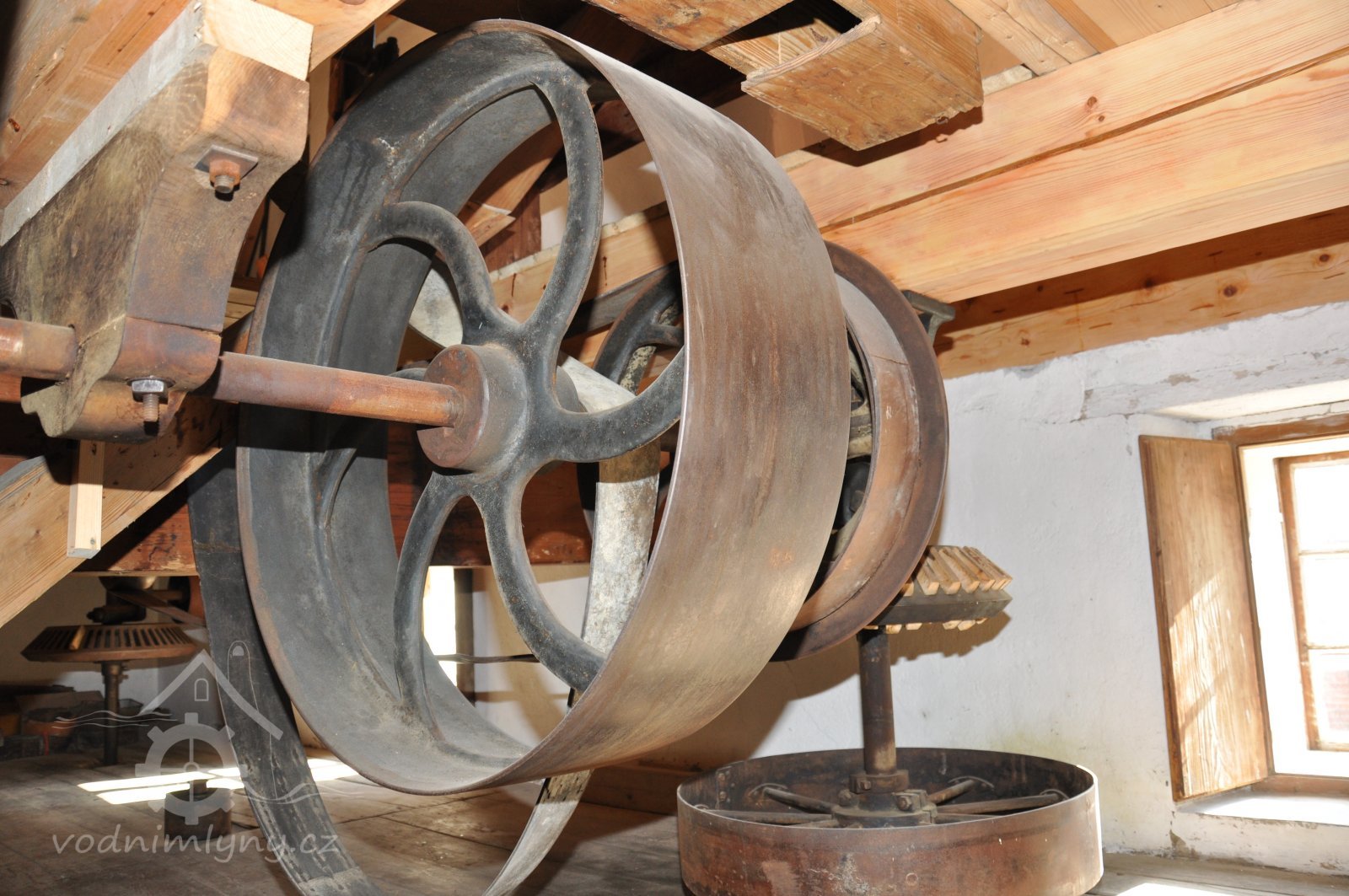 Pohled do podkolí uměleckého mlýna, 2013, © Šimek, (Prvky na obrázku: transmise, řemenice, převody)