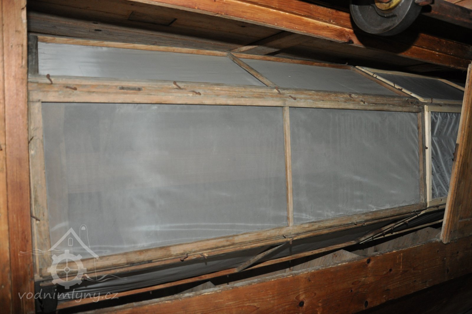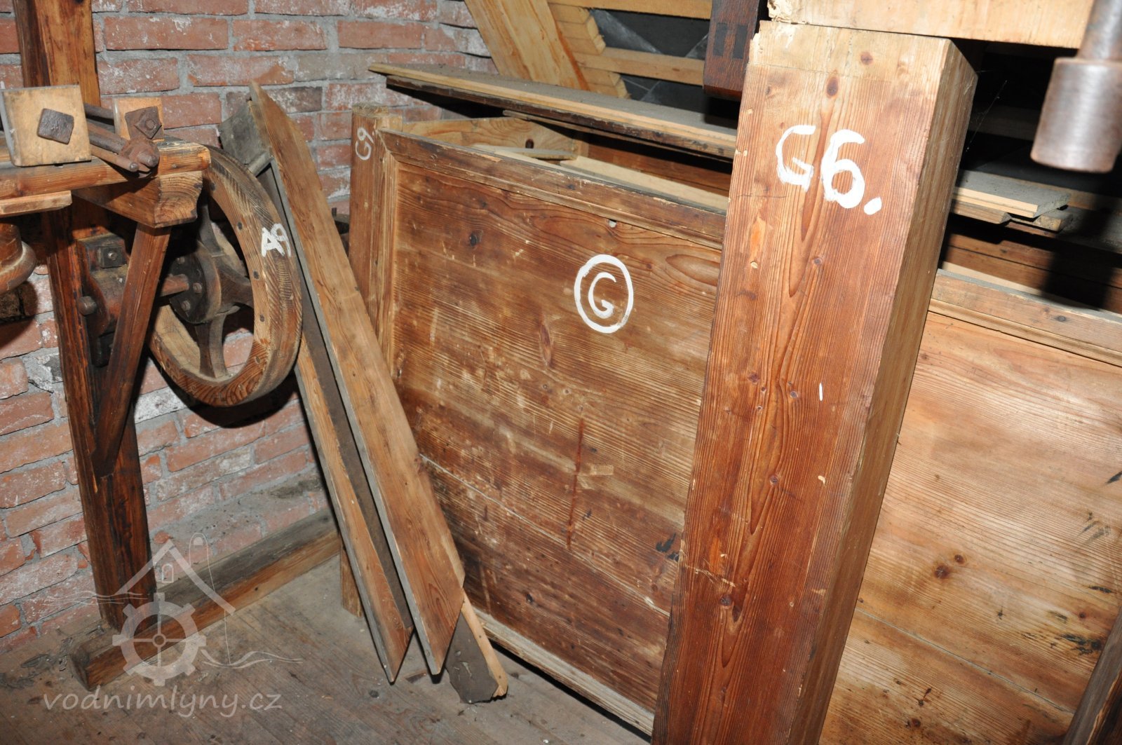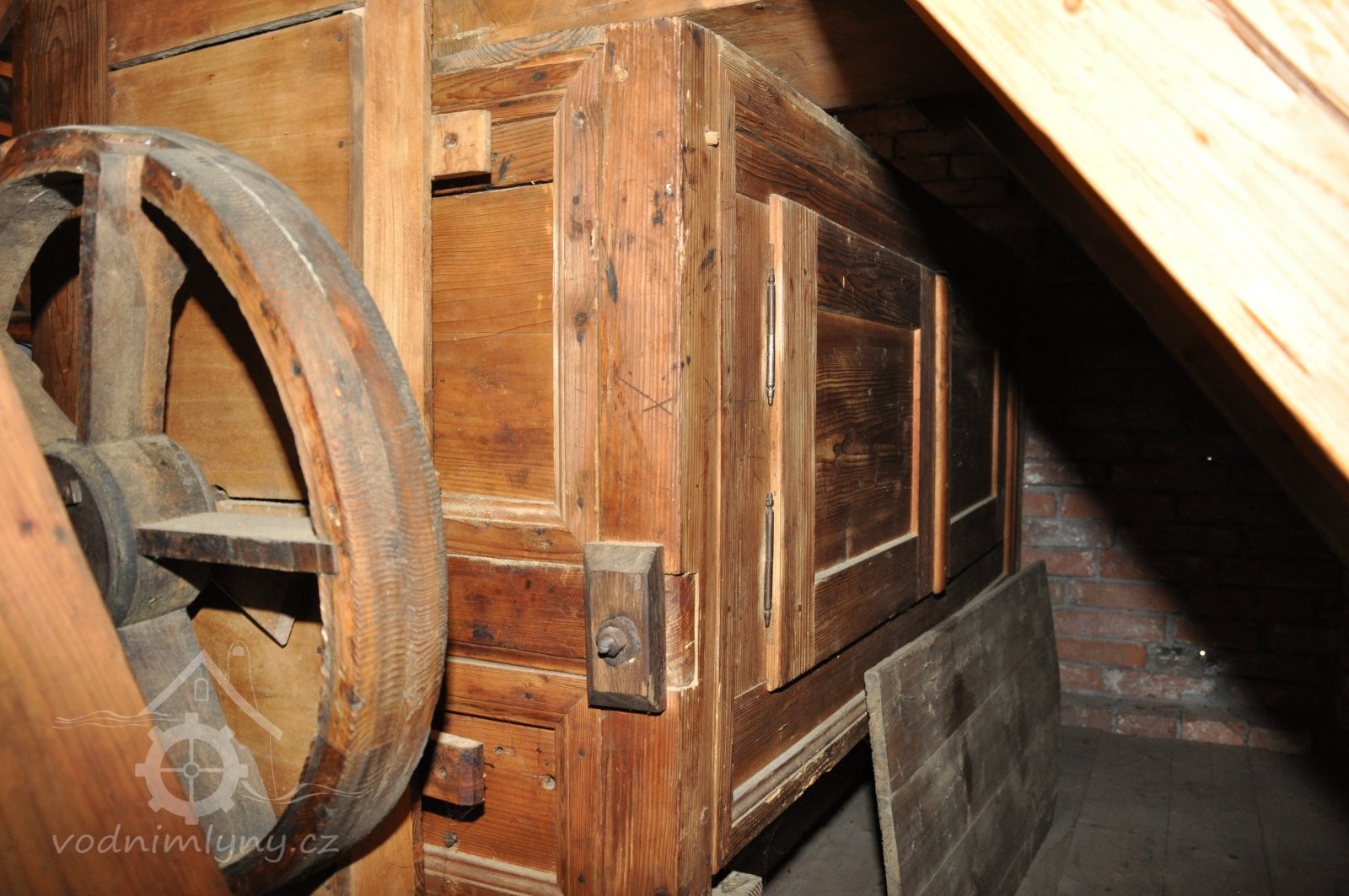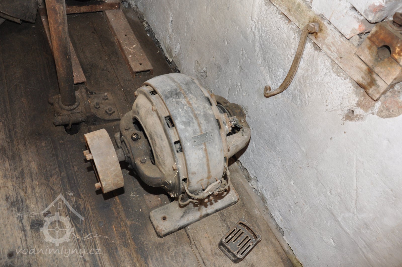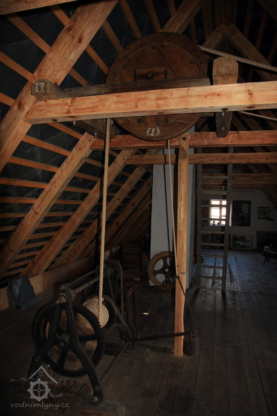 Pohled do podkolí uměleckého mlýna, 2013, © Šimek, (Prvky na obrázku: transmise, řemenice, převody)