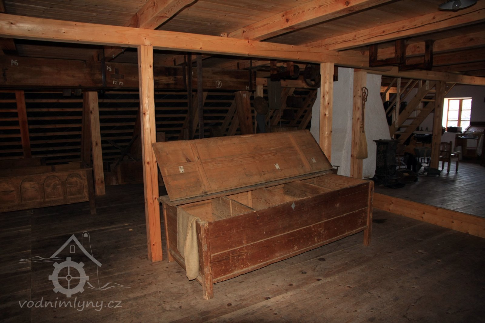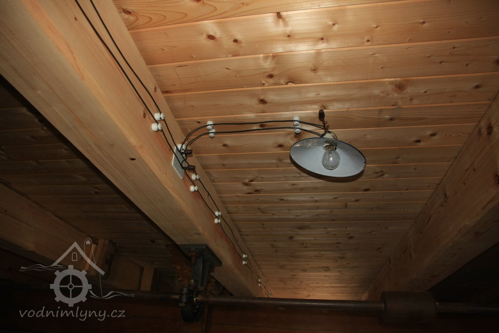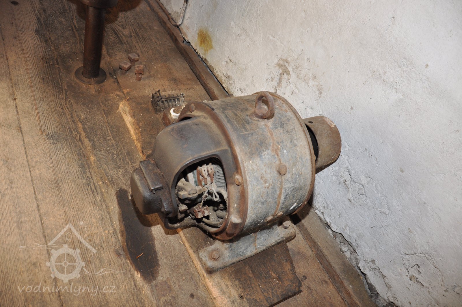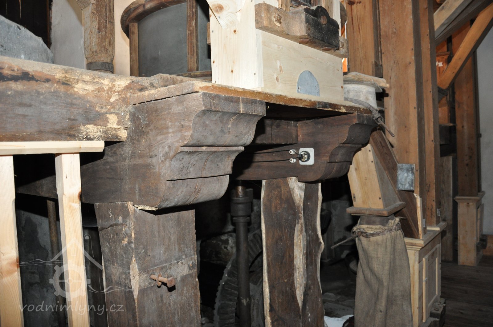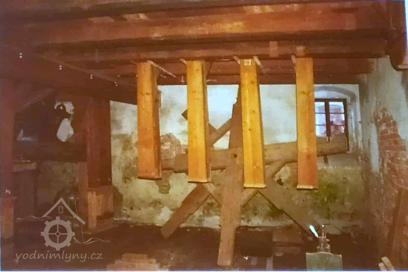 Pohled do podkolí uměleckého mlýna, 2013, © Šimek, (Prvky na obrázku: transmise, řemenice, převody)