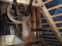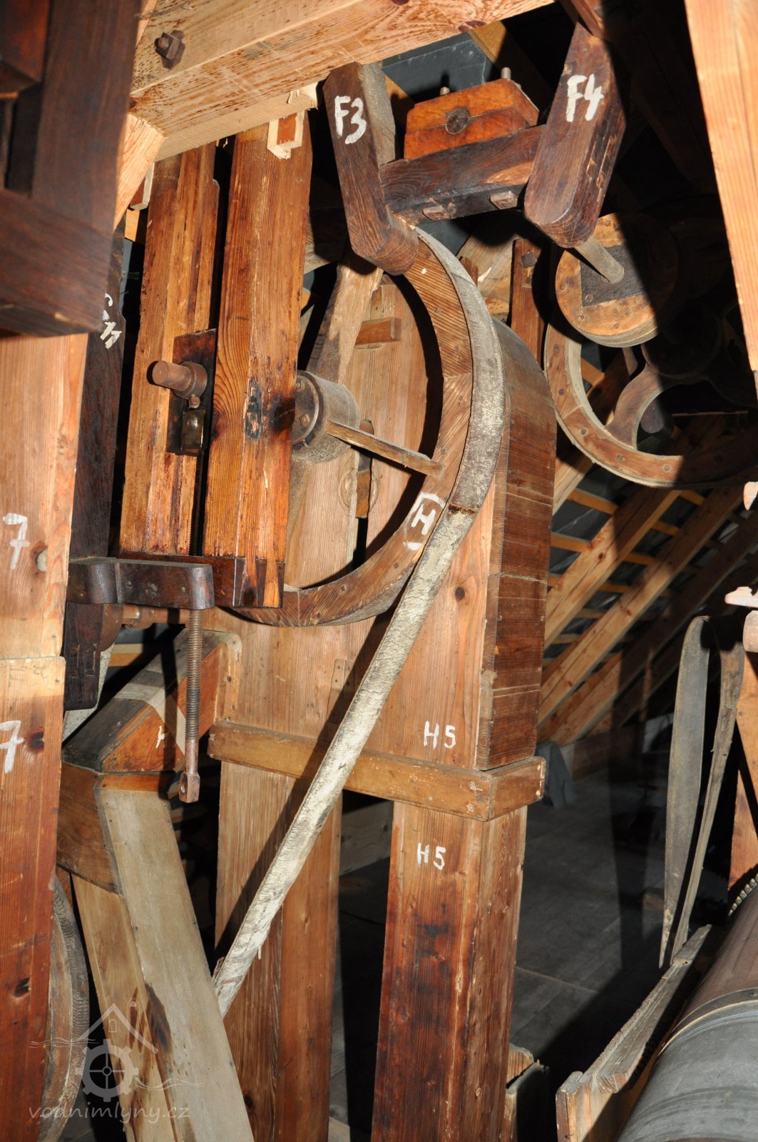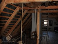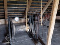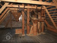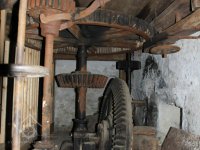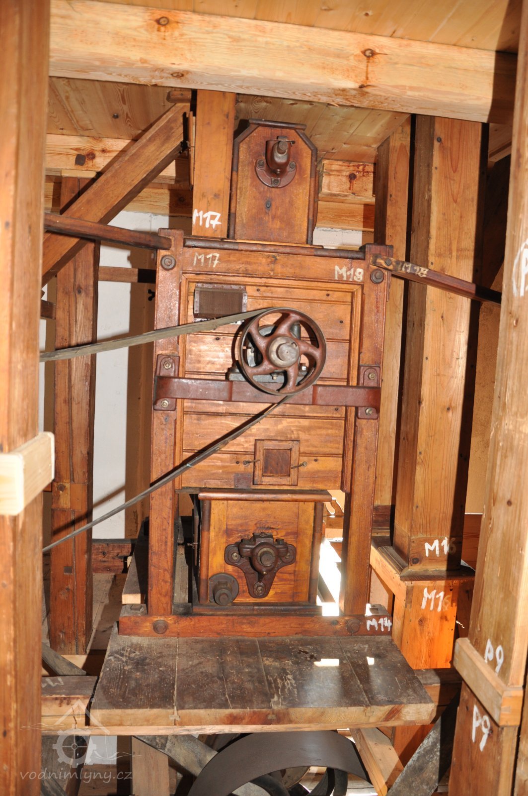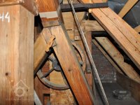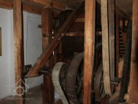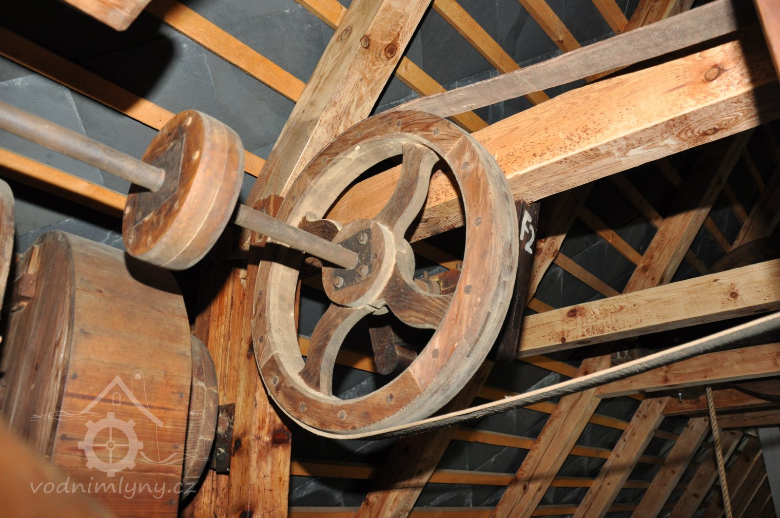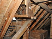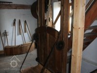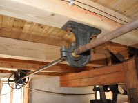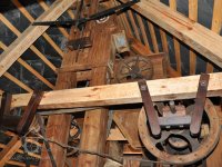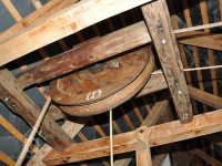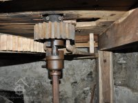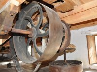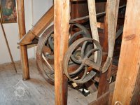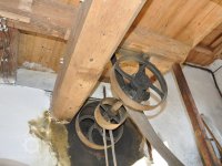 Převod z hřídele vodního kola na železí mlecího složení a královskou hřídel, 2013, © Šimek, (Prvky na obrázku: transmise, řemenice, převody)