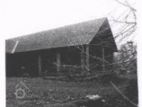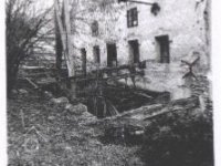 štítová stěna s transmisí vedoucí do protějšího objektu stodoly na druhém břehu náhonu před obnovou., 2003, © Alena Borovcová, (Prvky na obrázku: transmise, řemenice, převody)