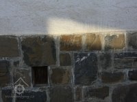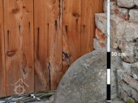 Vezděný mlýnský kámen ve východním pilíři jižní brány areálu, 2013, © J. Koudelová, (Prvky na obrázku: mlecí kámen)