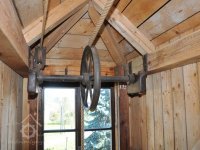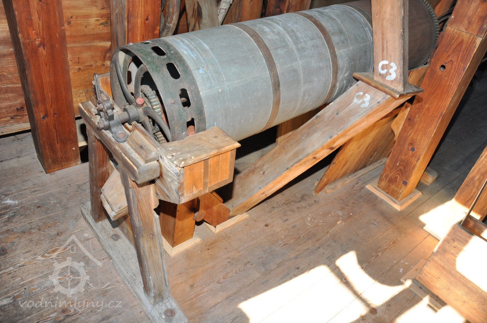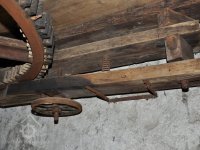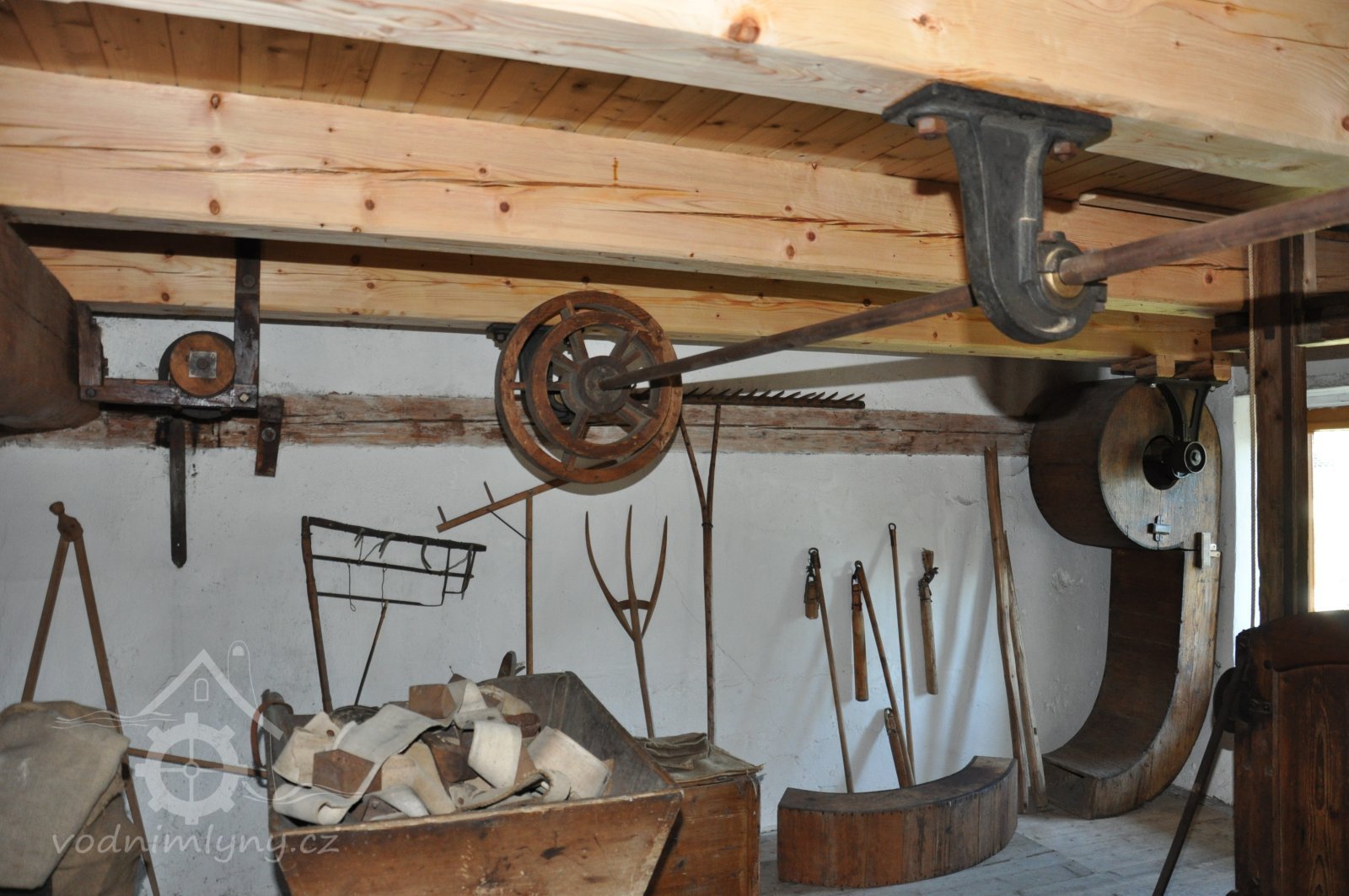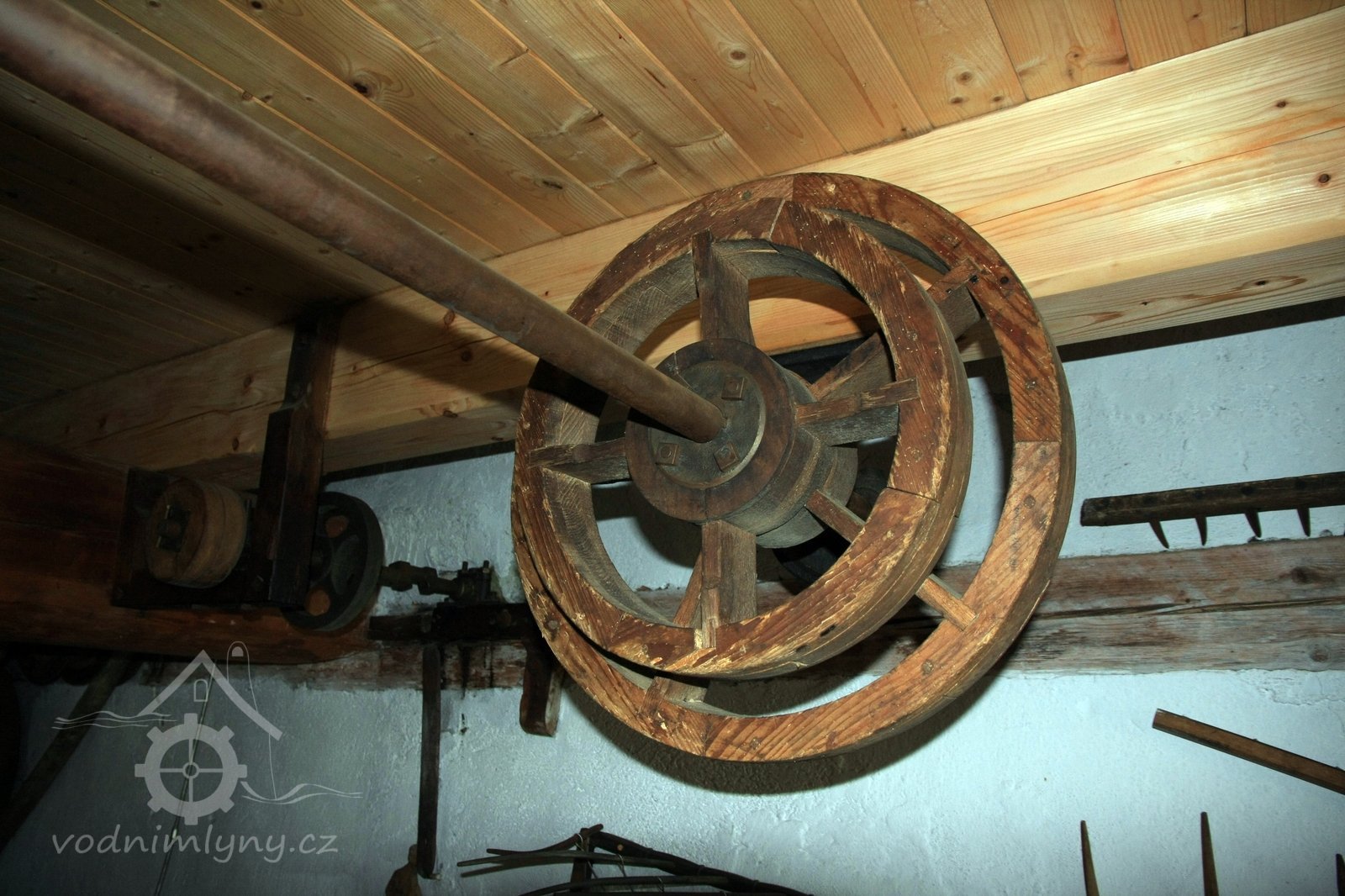 transmise mezi mlýnem a stodolou k pohonu zemědělských strojů na unikátní dřevěné konstrukci, 2014, © David Veverka, (Prvky na obrázku: transmise, řemenice, převody)