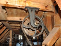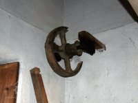 kladka pytlového výtahu, 2014, © David Veverka, (Prvky na obrázku: transmise, řemenice, převody, výtahy a dopravníky)
