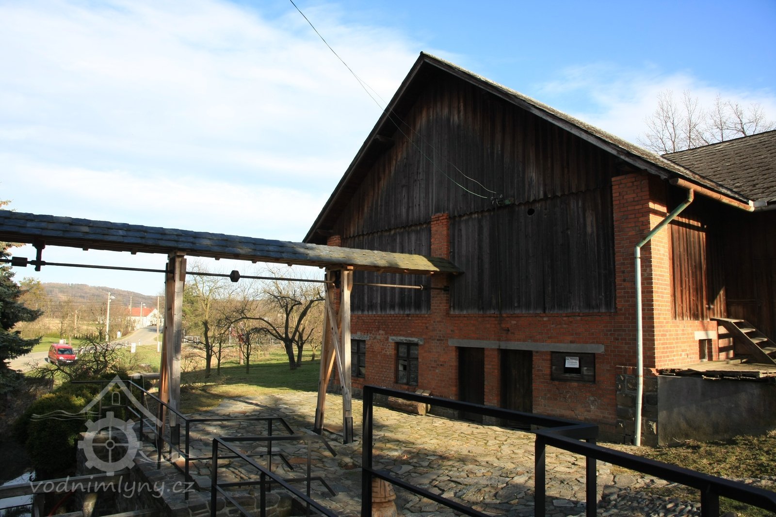 zastřešení nad transmisí vedoucí do protějšího objektu stodoly na druhém břehu náhonu po obnově, 2014, © Alena Borovcová, (Prvky na obrázku: transmise, řemenice, převody)