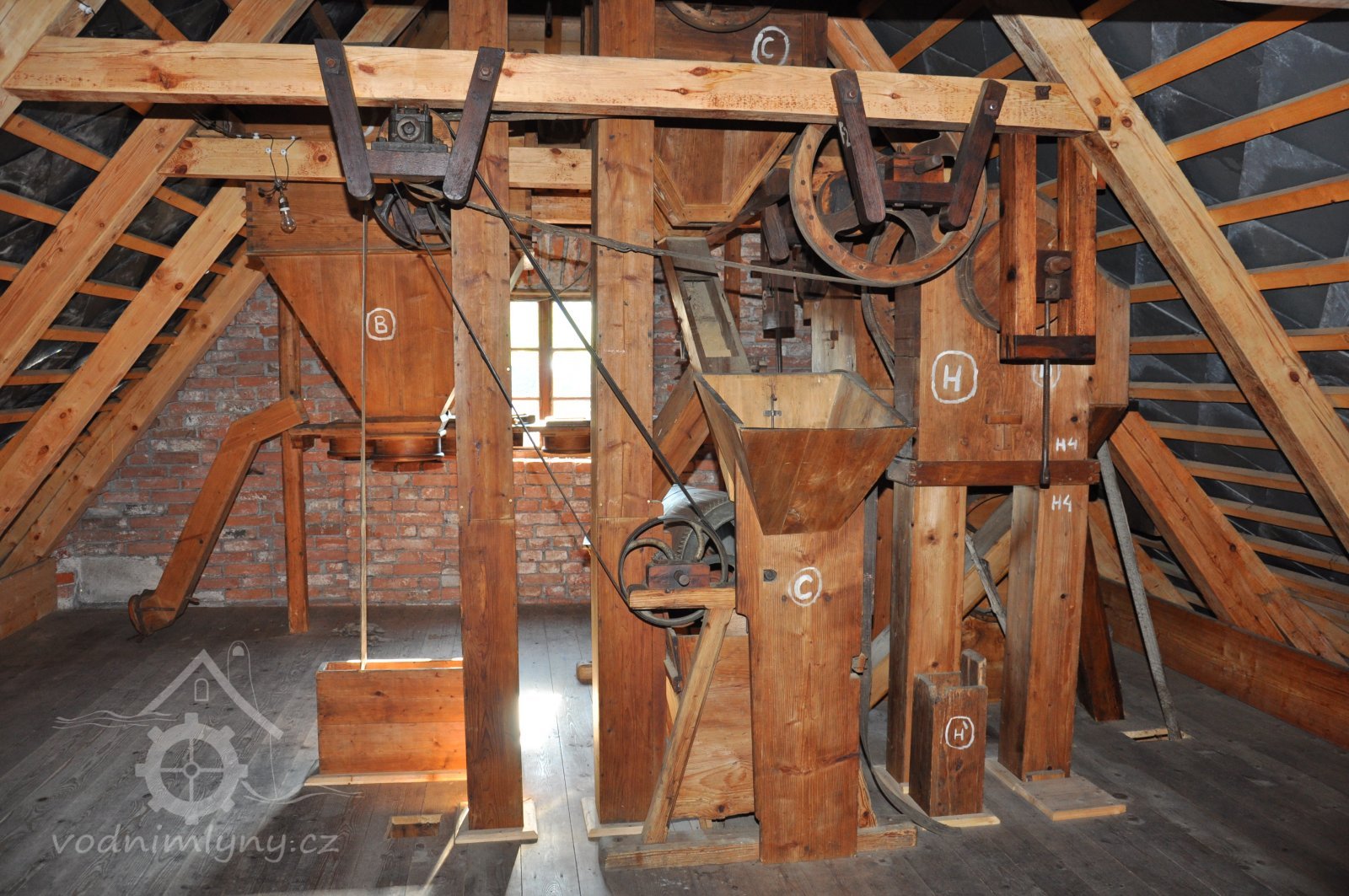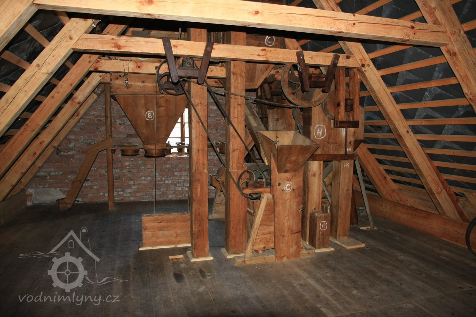 pohled na stroje v podstřeší, 2014, © David Veverka, (Prvky na obrázku: transmise, řemenice, převody, koukolník, vysévač hranolový, výtahy a dopravníky)