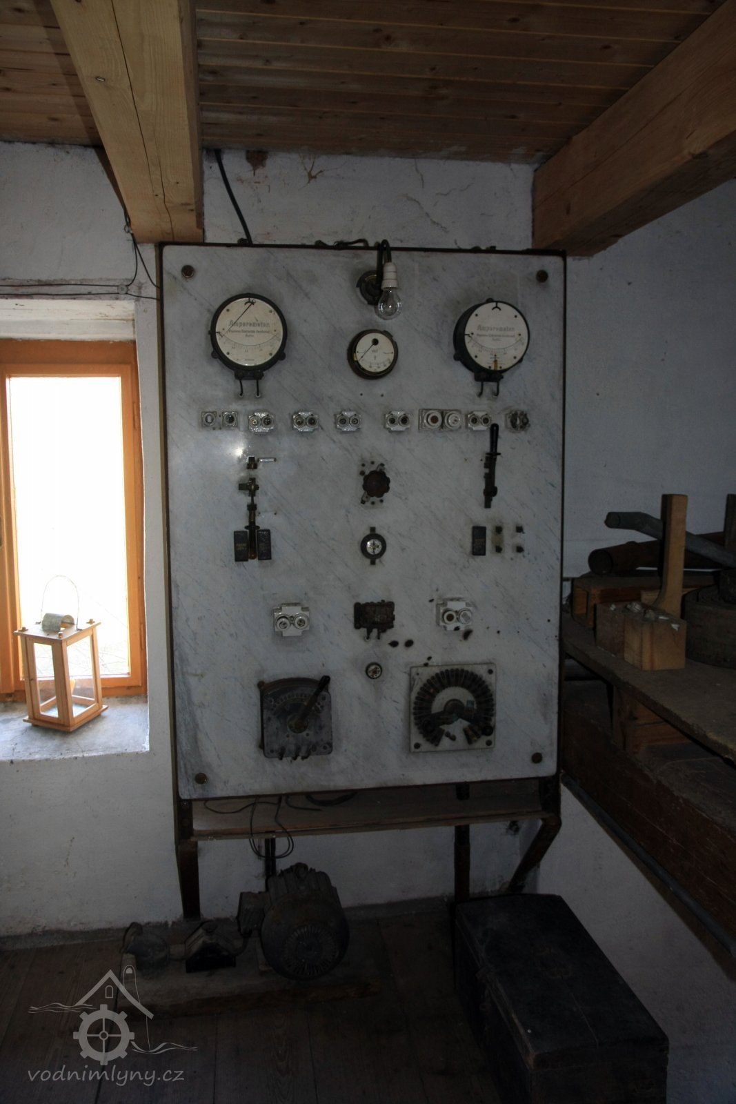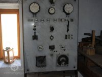 Transmise na 3. podlaží, 2013, © Šimek, (Prvky na obrázku: transmise, řemenice, převody, elektrická rozvodná deska)
