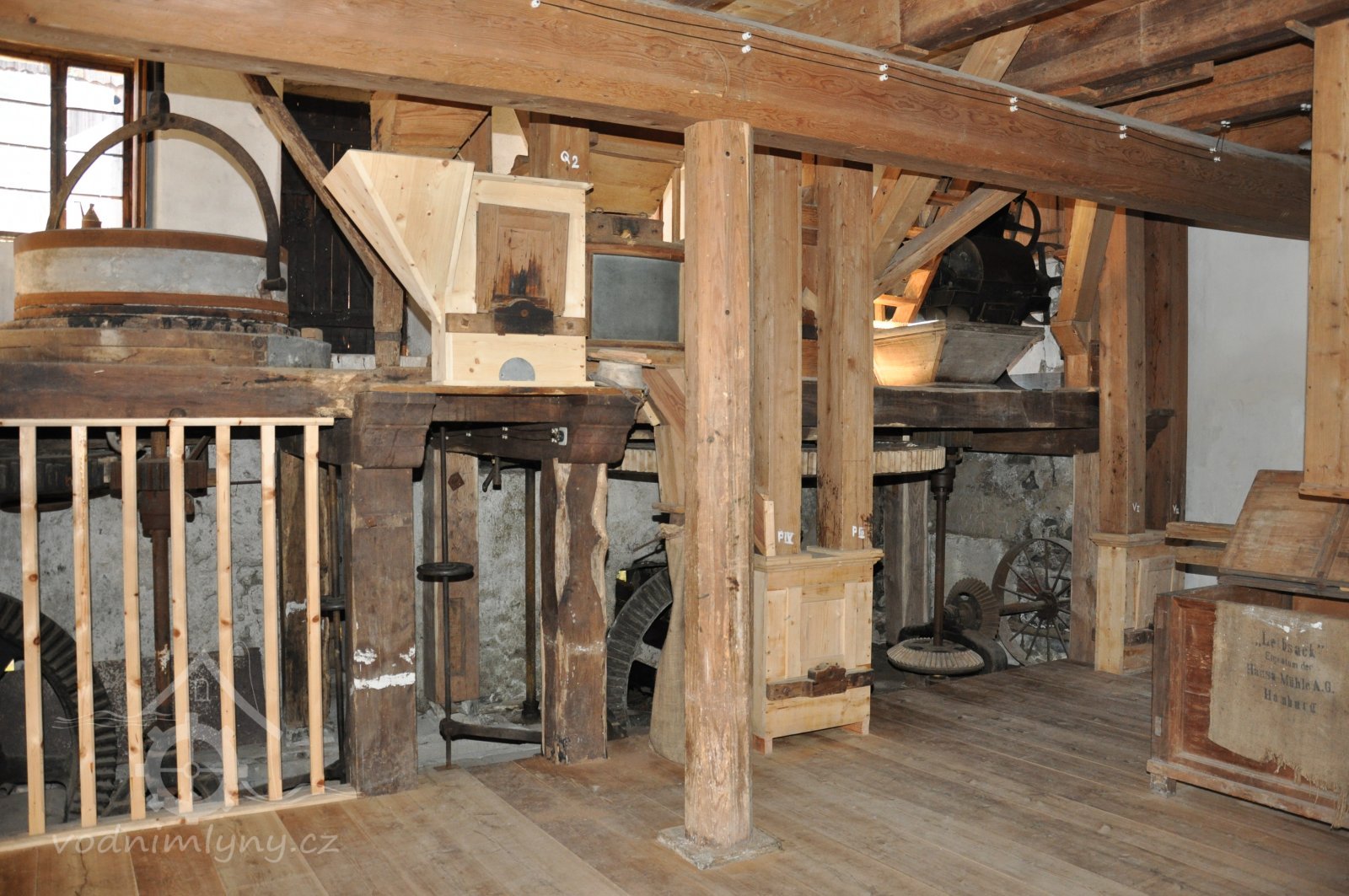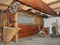 mlýnská podlaha, dvě složení (v popředí šrotovník bez násypného koše a lubu) a v pozadí válcová stolice, 09 2014, © Alena Borovcová, (Prvky na obrázku: kamenné složení (šrotovací, mlecí))