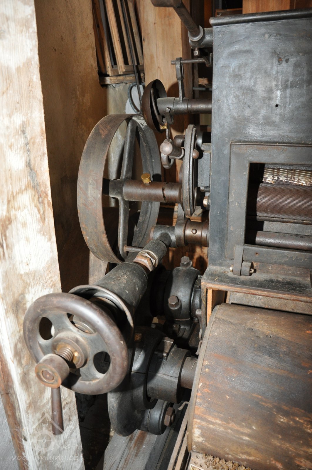 - válcová mlecí stolice v litinové skříni s rýhovanými válci, výrobce J. Hübner a K. Opitz - Pardubice z roku 1898, 2014, © David Veverka, (Prvky na obrázku: válcová stolice)