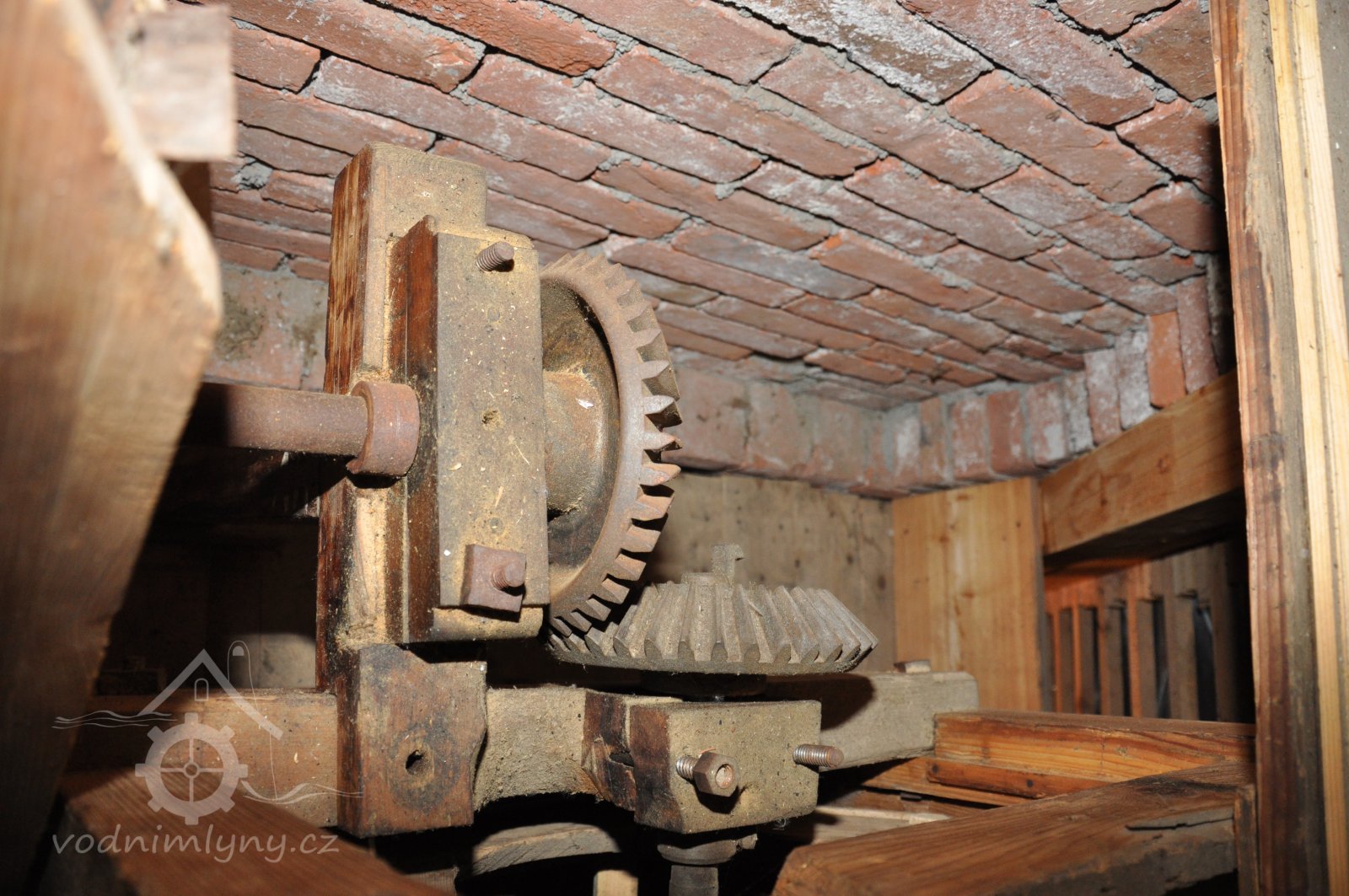 první pravoúhlý převod na 1. patře na rozvodovou transmisi mlýna, 2014, © David Veverka, (Prvky na obrázku: transmise, řemenice, převody)
