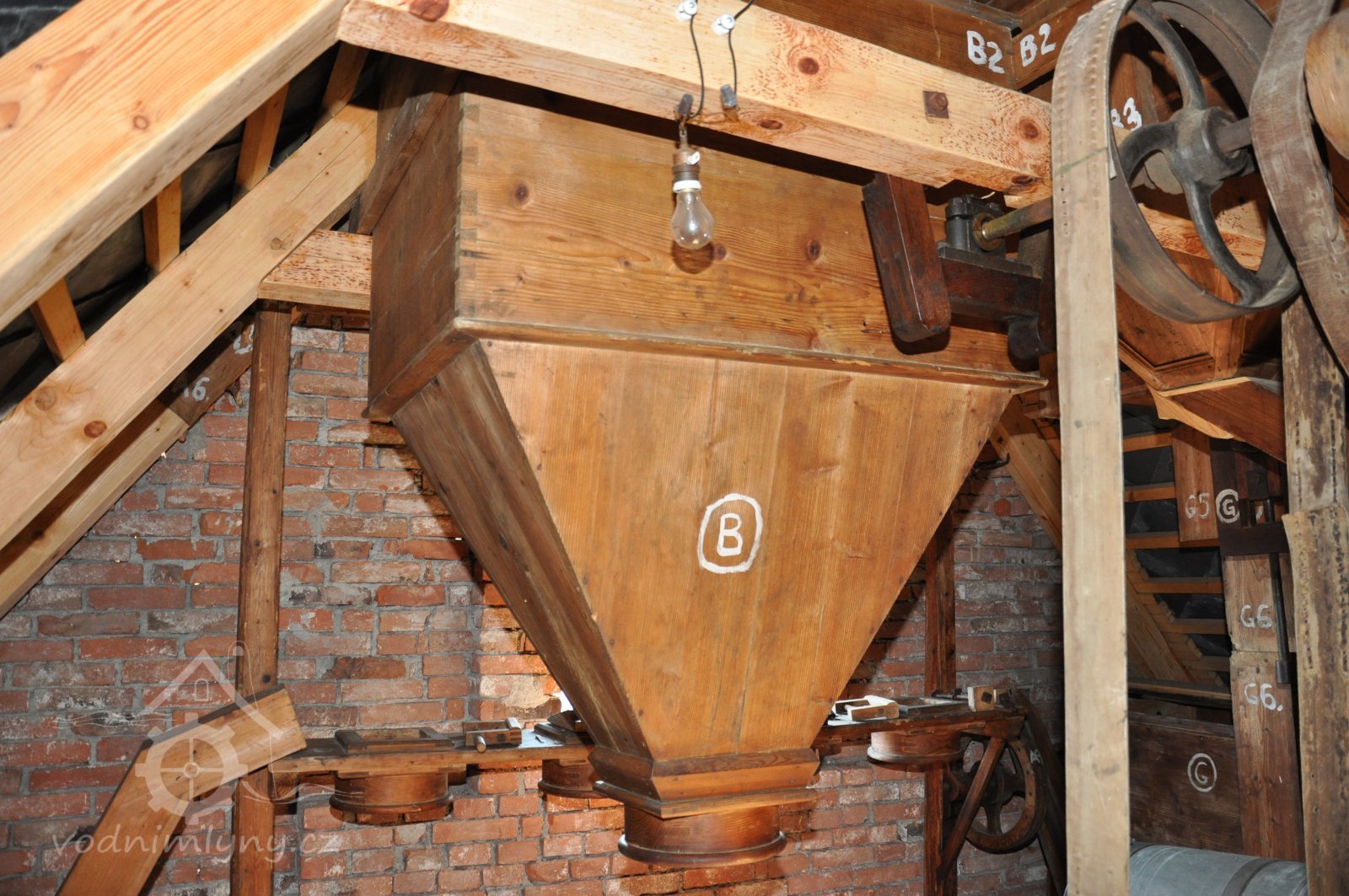 Transmise na 3. podlaží, 2013, © Šimek, (Prvky na obrázku: transmise, řemenice, převody, žejbro, výtahy a dopravníky, zásobník, násypka)