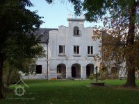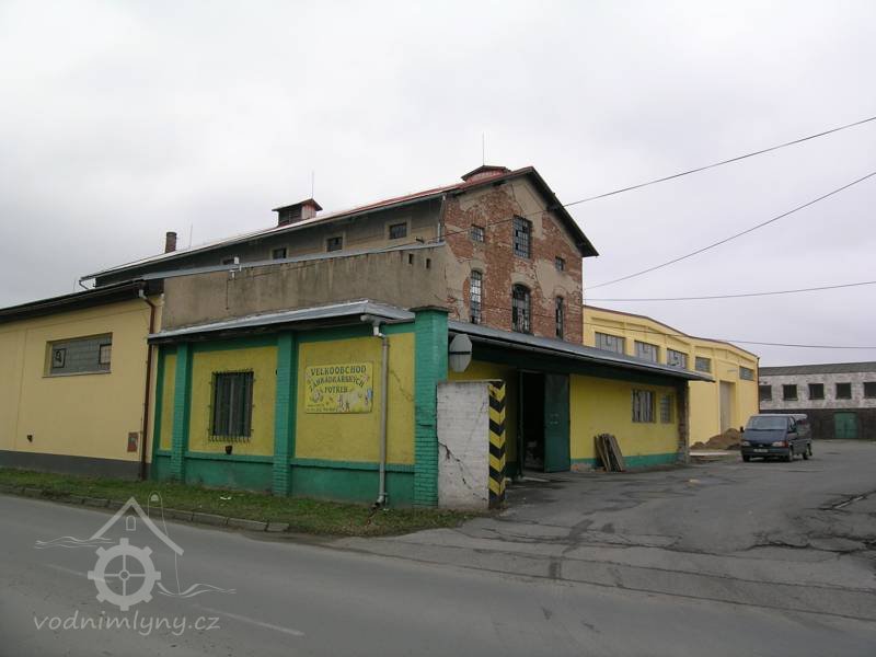 Vjezd do areálu a mlýn v pozadí, červenec 2016, © viz mapy.cz