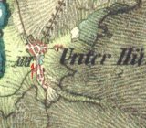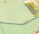 Otisk, skica i originální mapa stabilního katastru v roce 1838 – zakreslený náhon, spalná budova s jedním kolem, za mlýnem rybník, majitelem mlýna je Franz Hegerl.