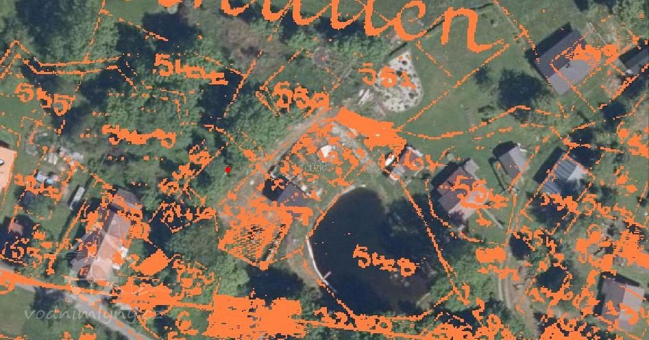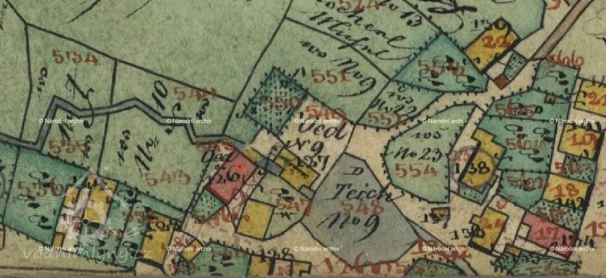 1838 – Na otisku a skice stabilního katastru je za rybníkem - který je součástí č. 9 - dřevěná budova pily, následuje nespalná obdélníková budova s dřevěným přístavkem a zakresleným jedním kolem, majitelem je Franz Landgraf, jméno potoka je Altbach ( Starý potok ).