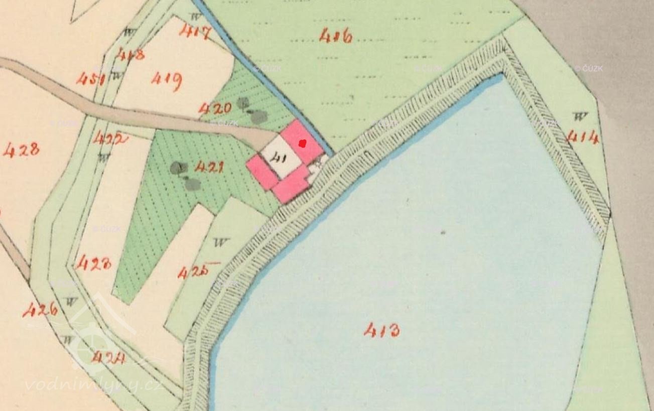 Mlýn zobrazován na mapách I. vojenského mapování. Budova mlýna ležela pod hrází rybníka naproti dnešní stavbě s ev.č. 34, což je možná bývalá hospodářská budova.