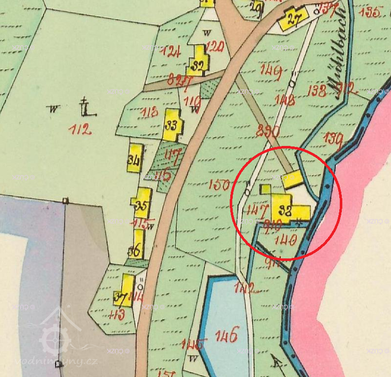Popis1930: 1 kolo na svrchní vodu, hltnost 0,06 m3/s, spád 4,4 m, výkon 2,83 HP, prům. 4,4 m