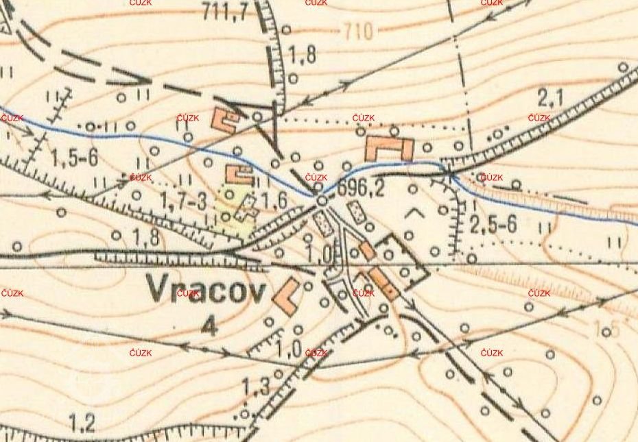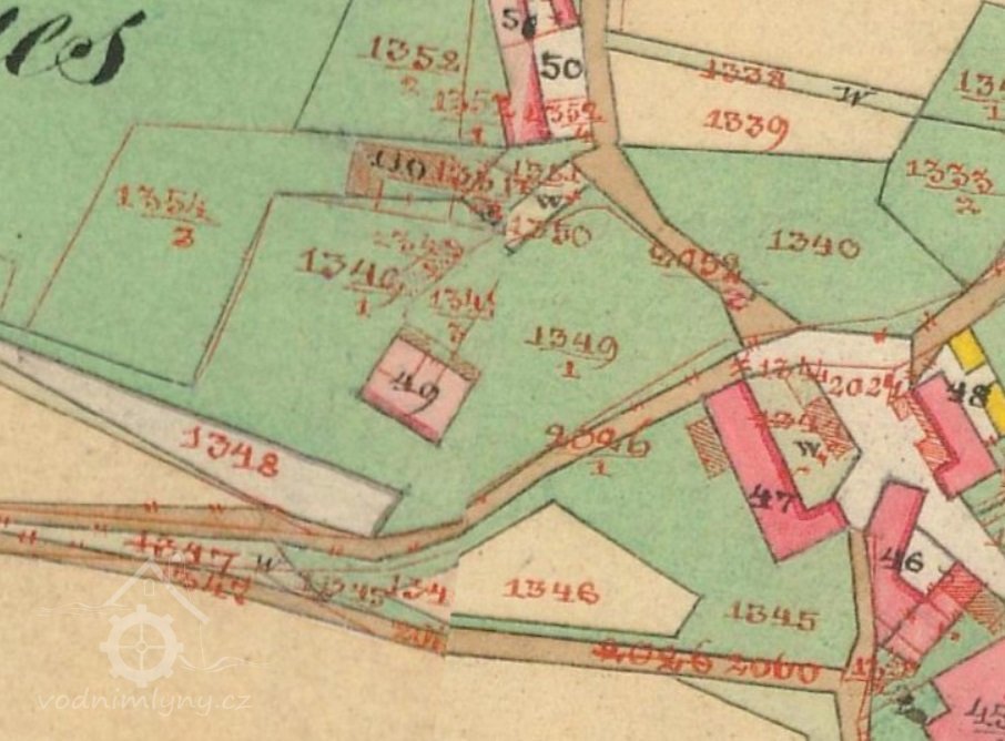Zaniklý mlýn s pilou o jednom kole na svrchní vodu.