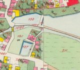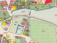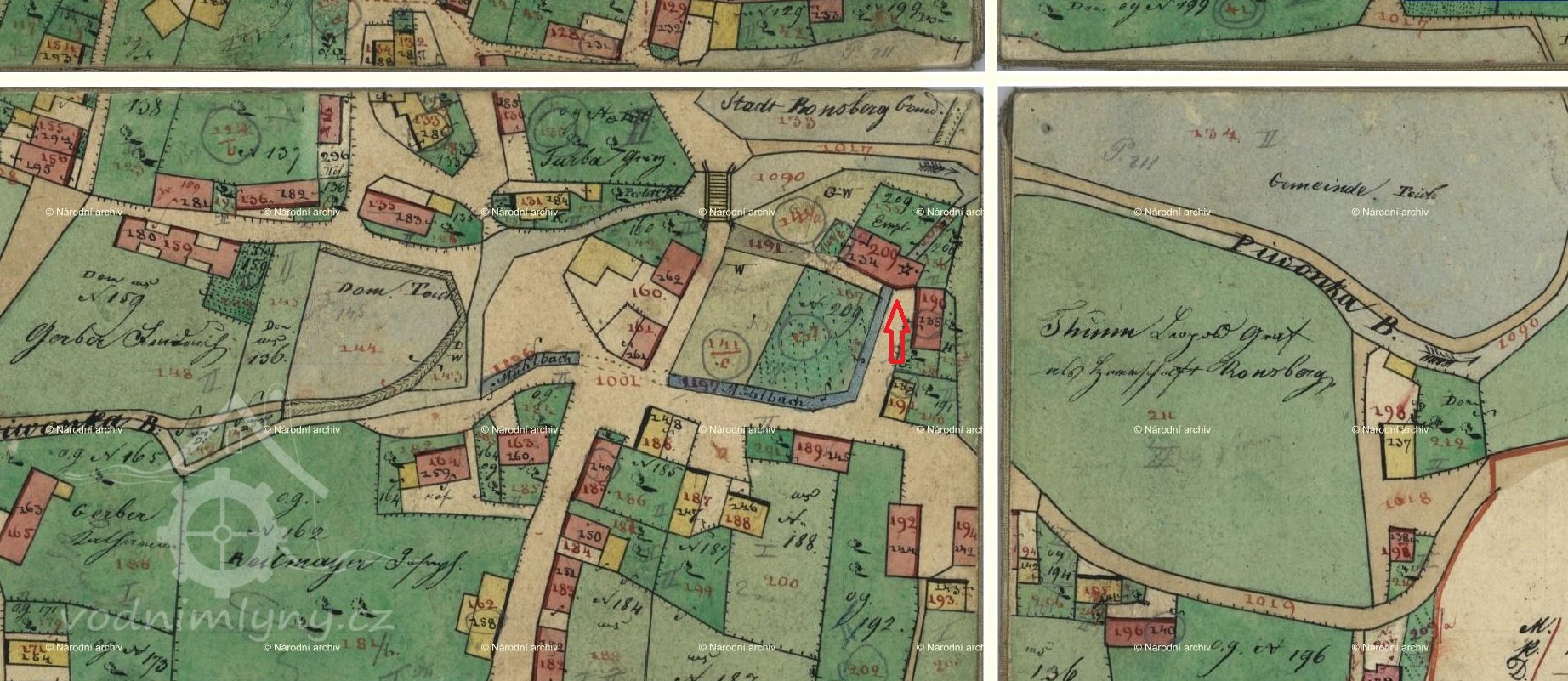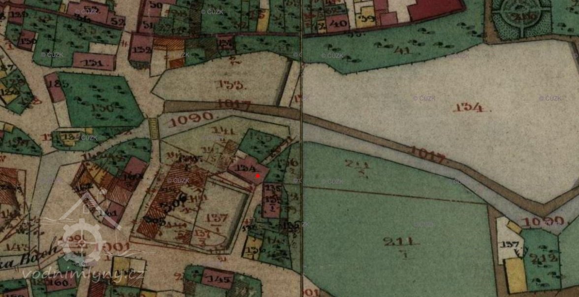 Indikační skica z roku 1838 - náhon z Pivoňky, větší nespalná budova, náhon vedl budovou, jedno kolo, za mlýnem se náhon opět spojuje s Pivoňkou. Originální mapa a otisk nejsou v místě publikovány. J. G. Sommer zmiňuje v Poběžovicích k roku 1839 mj. panský pivovar na 20 sudů, lihovar, papírnu, kovárnu, 3 mlýny a 2 mlýny na kroupy.