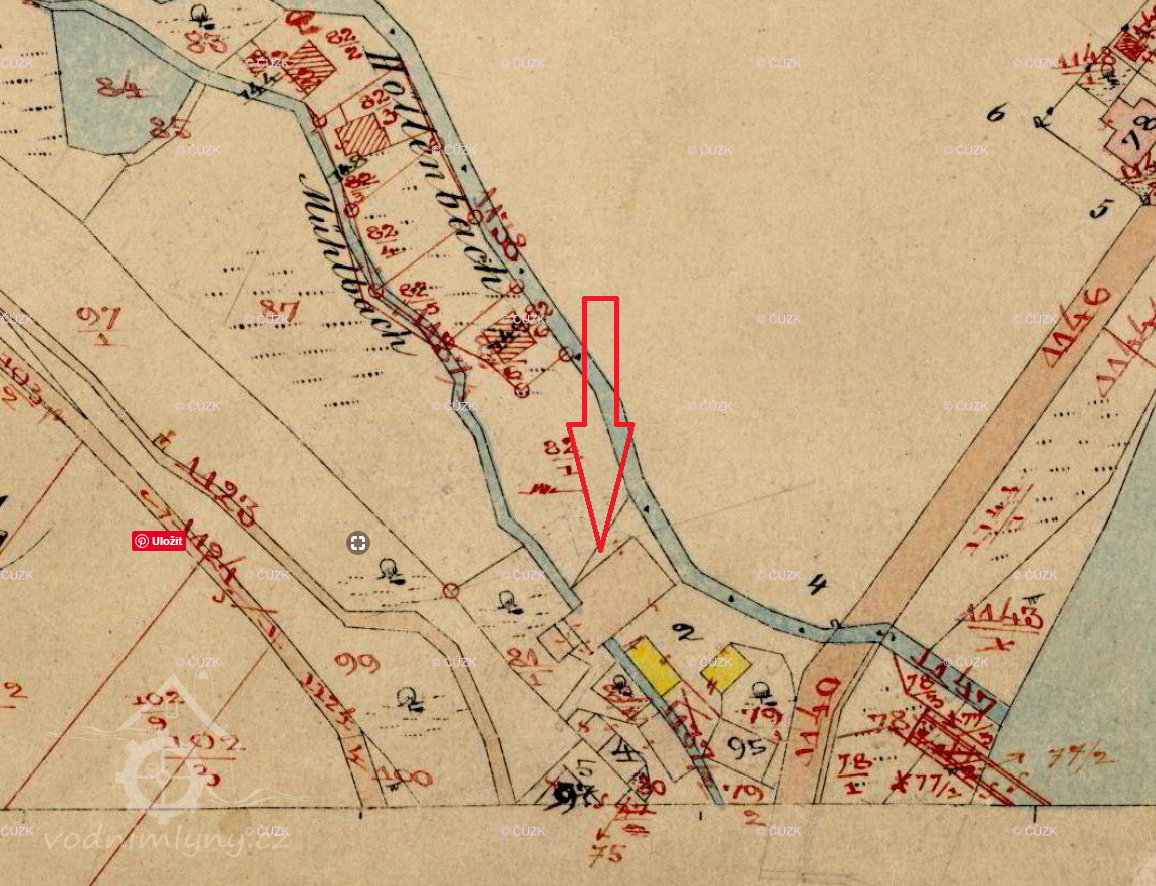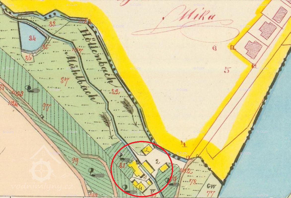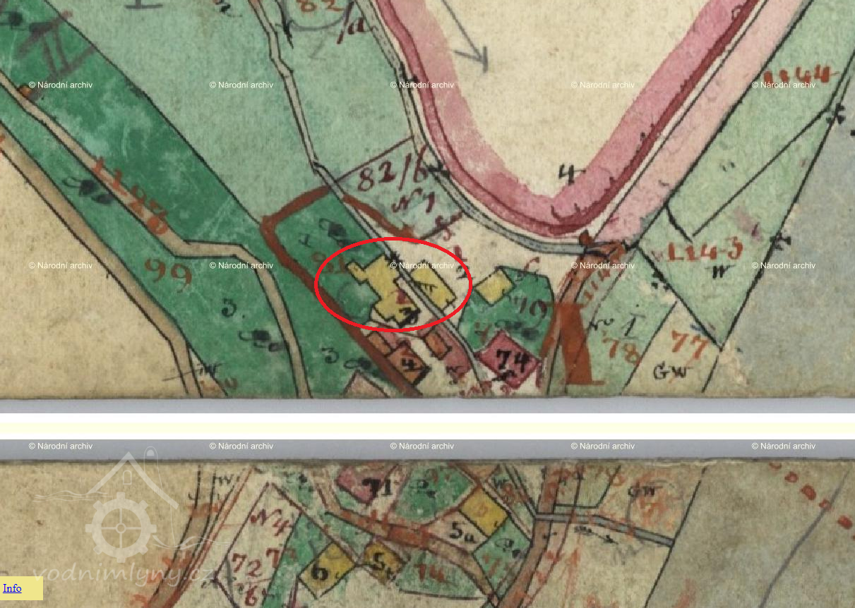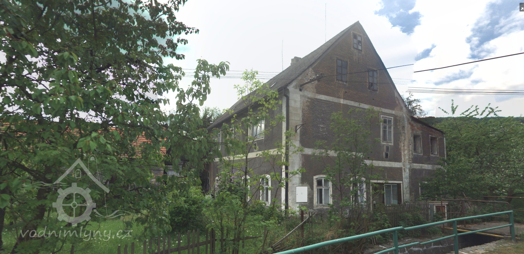 Mlýnská budova č. v. 1 [pozn. ministerstva: přístavek s turbínou nad mlýnským náhonem včetně nadzemního spojovacího mostku s hospodářským objektem (viz popis dále) není předmětem zobrazení v platné katastrální mapě]