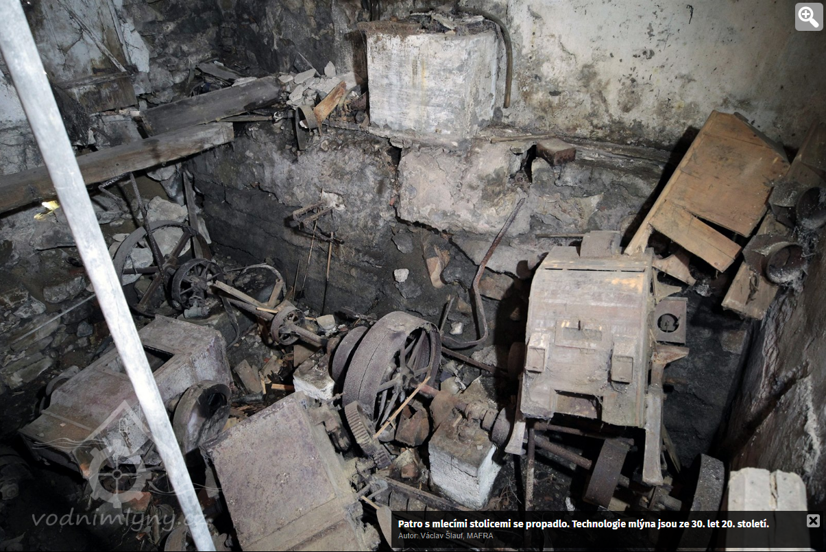 Vlevo ze síně je přístupný prostor mlýnice. Ve snížené úrovni bylo zasazeno mlecí soustrojí, hřídel, paleční kolo s transmisí. Do dřevěného trámového stropu jsou zasazeny násypné koše, šupny pro pytlování a další převody.