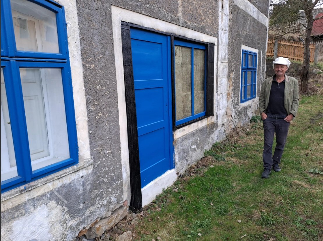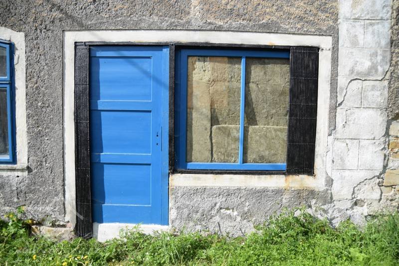 Vstup do domu je osazen dřevěnými dvoukřídlými dveřmi v asymetrickém provedení, s proskleným nadsvětlíkem se třemi lištami. Dveře mají ve dvou třetinách výšky vpadlou kazetu s výplněmi z fošen kladenými diagonálně (stromečkový způsob), v horní třetině s prosklenou tabulkou, doplněnou profilovanou římsičkou. Zasazené jsou na zapuštěné hladké závěsy do dřevěné trámkové zárubně.
